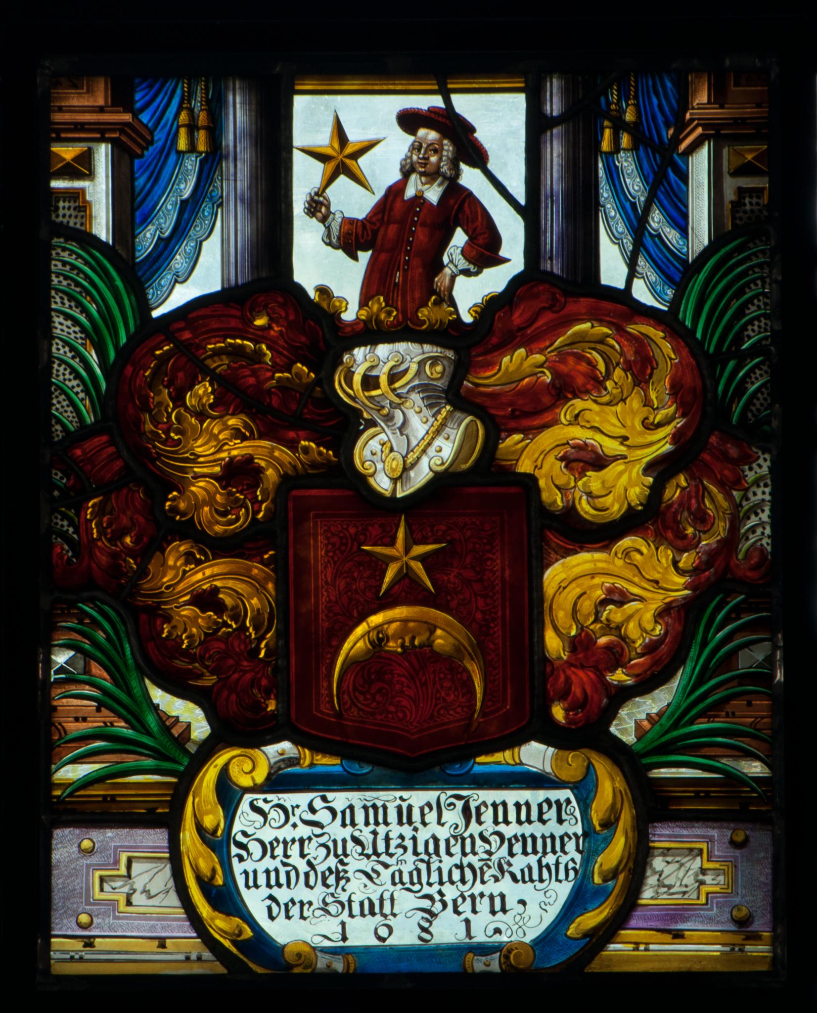 Die Stifterinschrift bezieht sich auf Samuel Jenner (1624–7.9.1699), den Sohn des Kleinrats Abraham Jenner. Samuel heiratete 1645 Margaretha Huber, die Tochter Peters, und 1660 Anna Margaretha von Graffenried, die Tochter Christophs. 1651 wurde er Berner Grossrat und 1654 Geleitsherr. 1656–1662 diente er als Vogt zu Wangen. Ab 1671 sass Jenner im Kleinen Rat und amtete ab 1682 mit Unterbrechungen bis zu seinem Tod als Venner zu Gerbern. Samuel Jenner war sehr vermögend. 1664 erwarb er die Herrschaft Utzigen und liess dort das frühbarocke Schloss errichten. 1682 verkaufte er Utzigen und richtete mit dem Erlös eine Familienstiftung ein. Samuel Jenner gehörten auch Schloss und Weinberg in Montagny ob Lutry (HBLS 4/1927, S. 397; HLS 6/2007, S. 780).