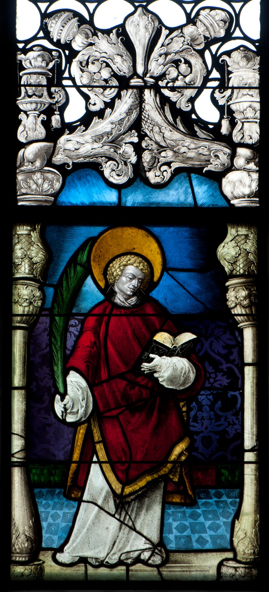 Vor blauem Grund steht der hl. Vinzenz vor blau gefliestem Boden auf dem Sockelfeld am Scheibenfuss, auf dem ebenfalls die beiden seitlichen Rahmensäulen mit ihren blattgeschmückten Basen und Kapitellen fussen. Berns Patron trägt als Diakon eine Albe und eine rote Dalmatika, wobei er wie üblich als Attribute Palmzweig und Buch in seinen Händen hält. Der blaue Grund hinter ihm ist im unteren Teil durch einen violetten Damastteppich mit grünen und roten Fransen überdeckt. Der die Scheibe bekrönende, opulente Renaissance-Giebel im oberen Fensterfeld ist eine moderne Kopie.