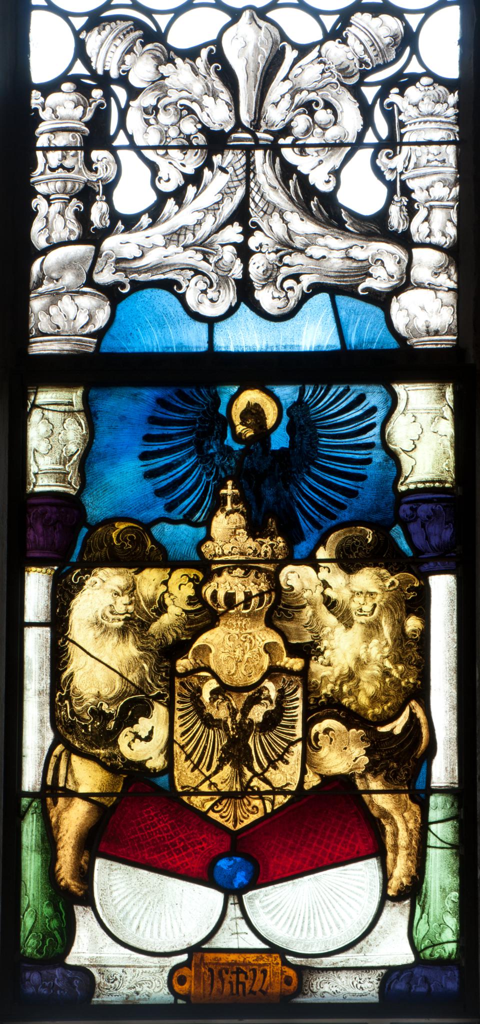 Vor blauem Grund steht die Wappenpyramide Solothurn-Reich auf dem niedrigen weissen Podium. Sie wird von zwei ebenfalls darauf postierten Löwen gehalten. Auf dem bekrönten goldenen Wappenhelm sitzt der Reichsadler mit dem Reichsapfel in den Klauen. Das Stiftungsjahr 1522 befindet sich auf der rostfarbenen Tafel am Scheibenfuss. Die seitliche Rahmung bilden zwei schlanke, in der unteren Hälfte ausladende, grün gefärbte Säulenschäfte mit violetten Kapitellen und Basen. Der die Scheibe bekrönende, opulente Renaissance-Giebel im oberen Fensterfeld ist eine moderne Kopie.