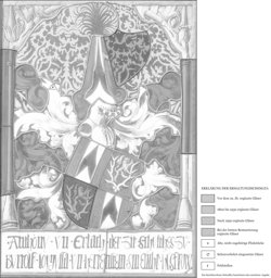 Um 1880 Johann Heinrich Müller, Bern? Von dieser Scheibe gibt es Pausenteile von Johann Heinrich Müller im Schweizerischen Nationalmuseum in Zürich (Inv. LM 24498; SNM Zürich, Foto 1 E5MW37A). Diese Pausenteile zeigen lediglich die Inschrift sowie grössere Teile der Helmdecke. In der Scheibe sind jedoch nur Stücke der Säulen und ein Stück des Damastes vermutlich von Müller ergänzt.