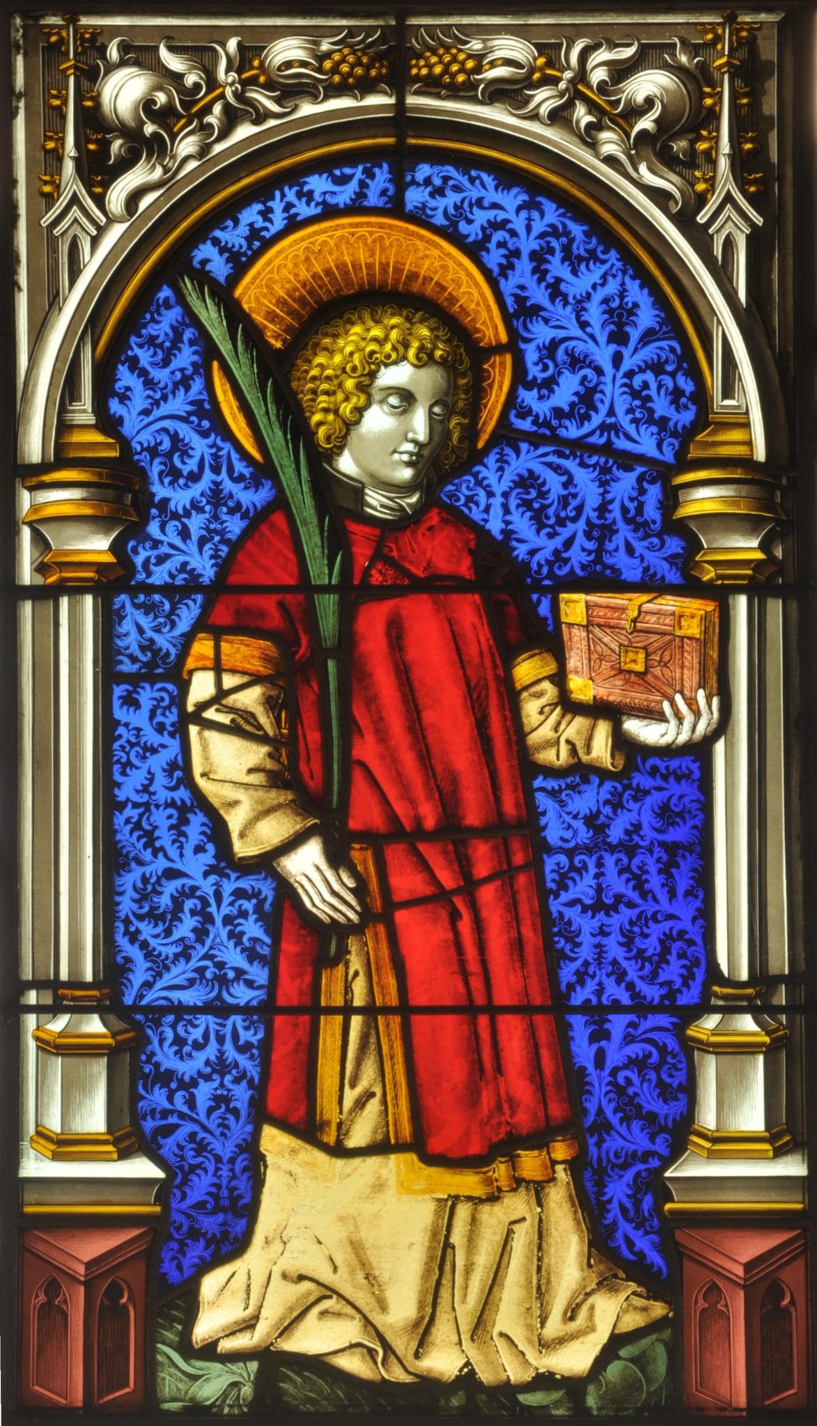 In eine Albe und rote Dalmatika gekleidet, steht Berns Patron vor blauem Damastgrund auf grünem Wiesenboden. Ihn seinen Händen hält er die ihn auszeichnenden Attribute, Palmzweig und Buch. Die Heiligenfigur wird von einem vollständig erneuerten spätgotischen Rundbogen umfasst.