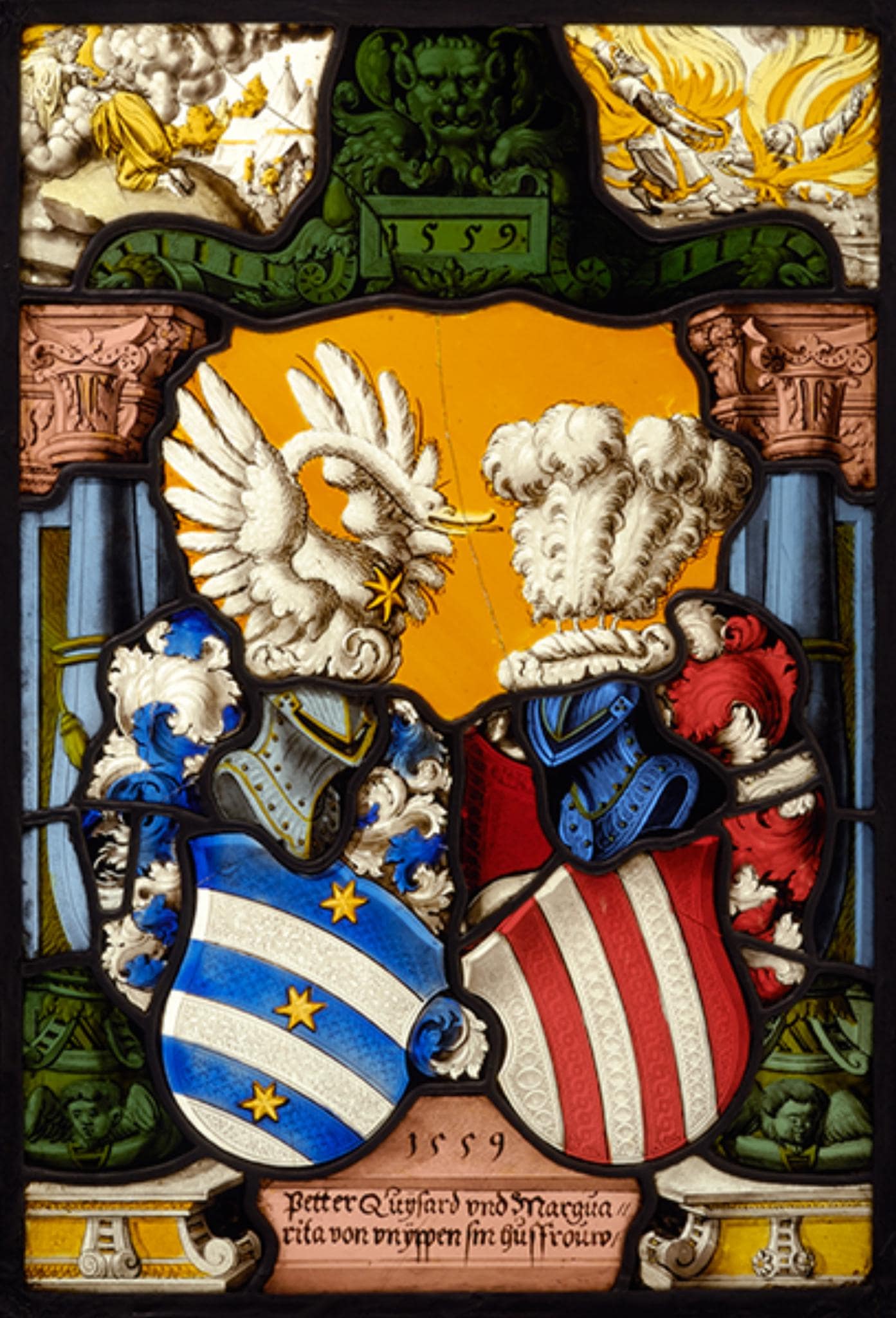 Vor gelbem Grund erscheinen die einander zugeneigten Vollwappen von Peter Quisart und Margaretha von Vuippens. Sie sind halb auf das rosa Podium mit den Stifternamen, halb auf die Postamente der seitlichen Doppelstützen gesetzt. Diese hellblauen Stützen aus Pilastern mit vorgestellten Balustersäulen besitzen grüne Sockel mit geflügelten Engelsköpfen und rosa Kapitelle. Darüber erhebt sich ein reich geschmückter grüner Volutenbogen, an dessen Scheitel die Tafel mit dem Stiftungsjahr unter einer Löwenmaske angebracht ist. Das durch den Bogen unterteilte Oberbild zeigt links den vor Gott knienden und von diesem Anweisungen für die Priesterweihe empfangenden Moses sowie rechts Nahab und Abihu, die bei ihrem Brandopfer vom Feuer verzehrt werden (Leviticus 8 und 10). Diese beiden Bibelillustrationen gehen auf die entsprechenden Holzschnitte in Hans Holbeins des Jüngeren Bilderbibel ("Icones") zurück.