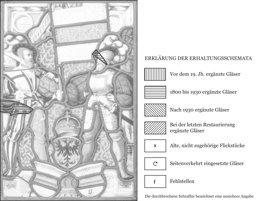 Die bekrönte Wappenpyramide Zug-Reich ist vor das hellrosa Podium am Scheibenfuss gesetzt. Zwischen den beiden Zuger Schilden ist an diesem das Stiftungsjahr festgehalten. Das Podium dient gleichzeitig als Standfläche für die beiden vor blauem Nelkendamast stehenden Schildbegleiter. Bei ihnen handelt es sich um einen Krieger mit geschultertem Zweihänder und um den Zuger Bannerträger. Letzterer erscheint in rotem Hemd und rosa Hosen, einem stahlblauen Halbharnisch und einem schwarzen Federbarett. Wie sein Kollege ist er mit Schwert und Schweizerdolch bewaffnet. Dieser trägt Hemd und Hosen in den Miparti-Farben Gelb und Schwarz-Weiss gestreift. Hinter den beiden Männern erhebt sich eine Säulenrahmung mit hellrosa Volutenbogen. Die Eckfelder neben diesem Bogen füllen butzenverglaste Rundfenster.
