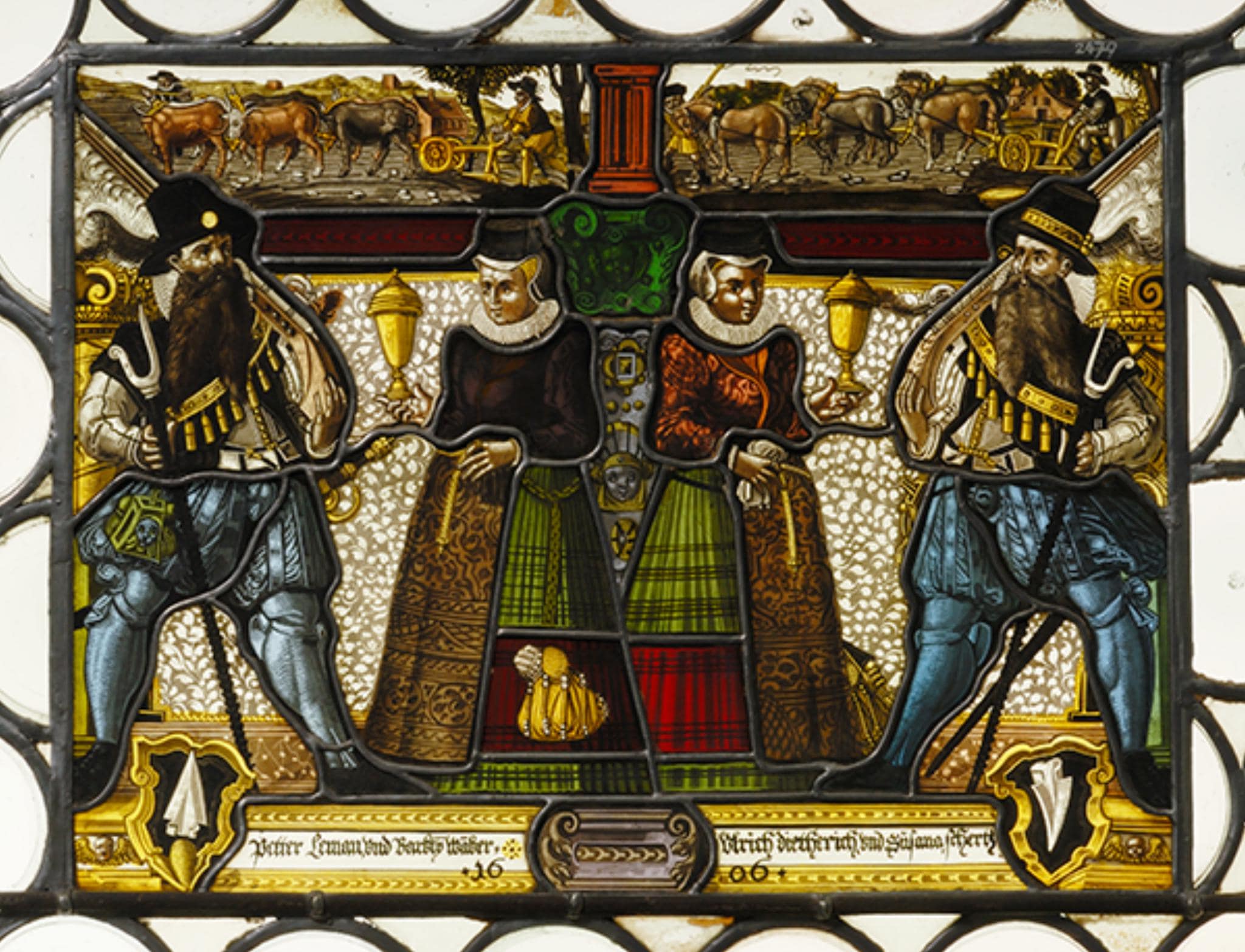 Die Willkommscheibe zeigt die beiden gegengleich komponierten Stifterpaare vor einem weissen, aus brauner Lasur radierten Blattdamast. Die beiden langbärtigen, in blaue Beinkleider, ein weisses Hemd und ein schwarzes Wams gehüllten und mit einem Federhut bedeckten Männer haben ihre Büchse geschultert und halten in der Hand die Gewehrgabel. Ihre in einen langen grün-roten Rock und eine damaszierte Schürze gekleideten Frauen präsentieren ihnen den Willkommenstrunk in einem Pokal. Zu Füssen der beiden Stifter sind am Podium mit der Stifterinschrift deren Wappen platziert. Hinter den Figuren erhebt sich eine Rahmenarchitektur mit einer violetten, kopfgeschmückten Mittelstütze und einem roten Gebälk. Im Oberbild sind zwei Bauern beim Pflügen mit einem Ochsen- bzw. Pferdegespann dargestellt.