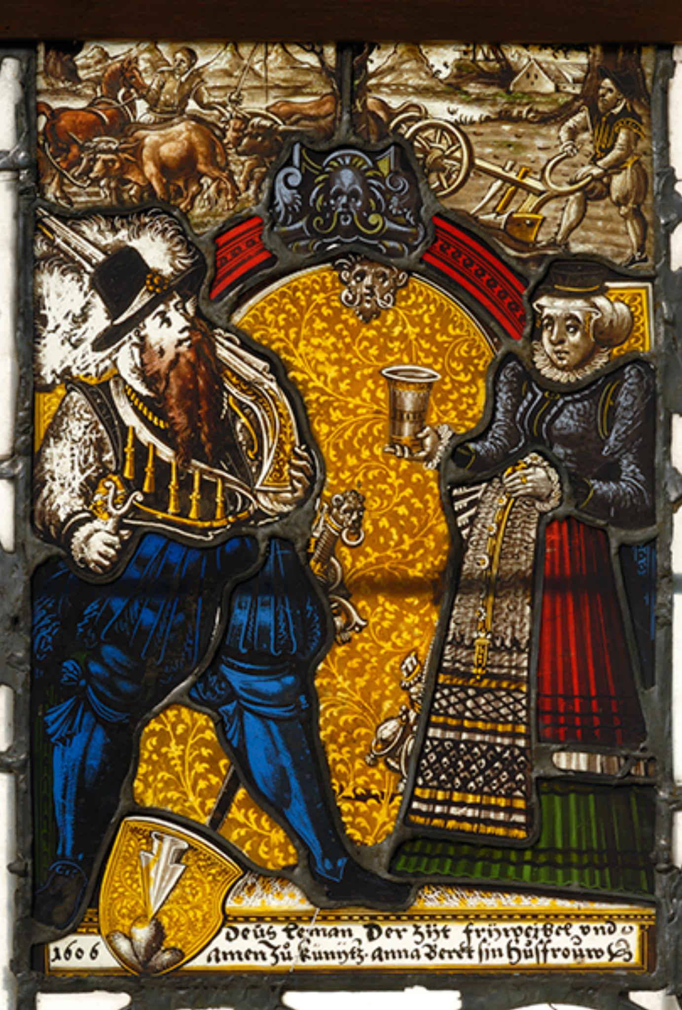 Vor gelbem, aus hellbrauner Lasur radiertem Blattdamast steht sich das Stifterpaar einander gegenüber. Der bärtige, schwertbewaffnete Mann links erscheint in blauen Hosen und Strümpfen, grauem Hemd sowie schwarzem Wams und Federhut. Er hat seine Büchse geschultert und hält in der Rechten die Gewehrgabel. Seine Frau trägt ein hellviolettes Mieder, einen langen roten Rock mit grünem Endbesatz sowie eine reich gemusterte Schürze. Sie hält ihrem Mann den Becher mit dem Willkommenstrunk entgegen. Hinter den Figuren ragt ein roter Bogen mit maskengeschmückter Scheitelkartusche in die Höhe. Im Oberbild sind zwei Bauern beim Pflügen mit einem Ochsengespann festgehalten. Zu Füssen des Stifters ist sein Wappen am beschrifteten Podium angebracht.
