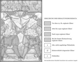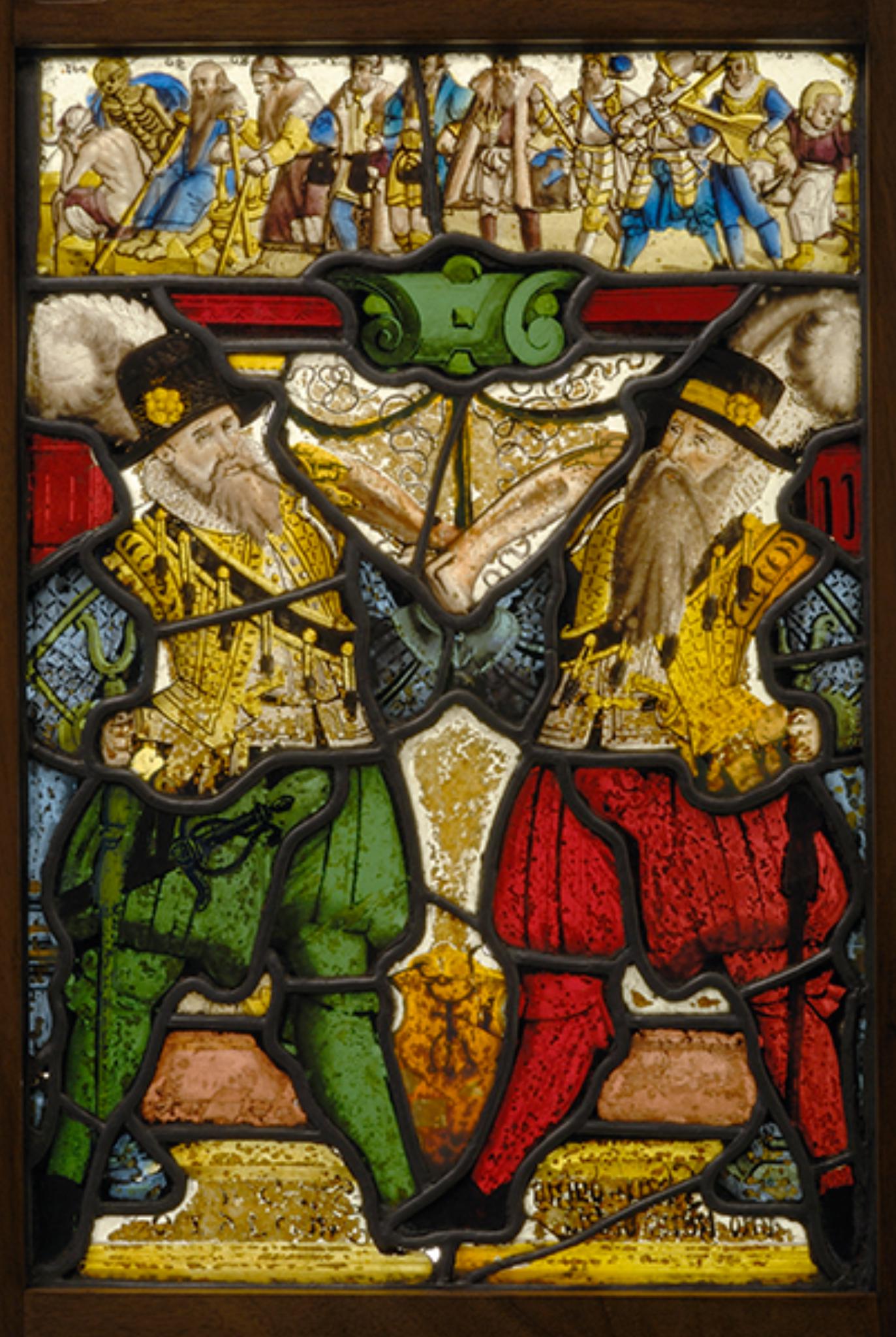 Im Zentrum sind zwei bärtige Schützen vor schnurverziertem farblosem Grund und einer niedrigen rosa Brüstung dargestellt. Beide tragen ein blaues Hemd, ein Lederwams, einen schwarzen Federhut sowie Pluderhosen und Strümpfe in der Farbe Rot bzw. Grün. Das Patronenbandelier um ihre Brust gebunden, halten sie in der einen Hand die Gewehrgabel und in der anderen die geschulterte Büchse. Ihr gemeinsames Wappen ist zwischen ihren Innenbeinen platziert. Die Rahmung besteht aus blauen Säulen mit roten Kapitellen und einem roten Gebälk. Das Oberbild ist der Allegorie der Lebensalter gewidmet. Von links nach rechts aufgereiht sind zehn männliche Figuren, die das Menschenleben von der Kindheit bis zum Tod dezennienweise versinnbildlichen.