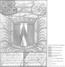 Die Ecke oben links sowie je ein kleines Stück im Wappen und im Schriftfeld neu ergänzt (s. u.); ein Ausbruch oben rechts; mehrere Sprünge und Sprungbleie; die Verbleiung erneuert.