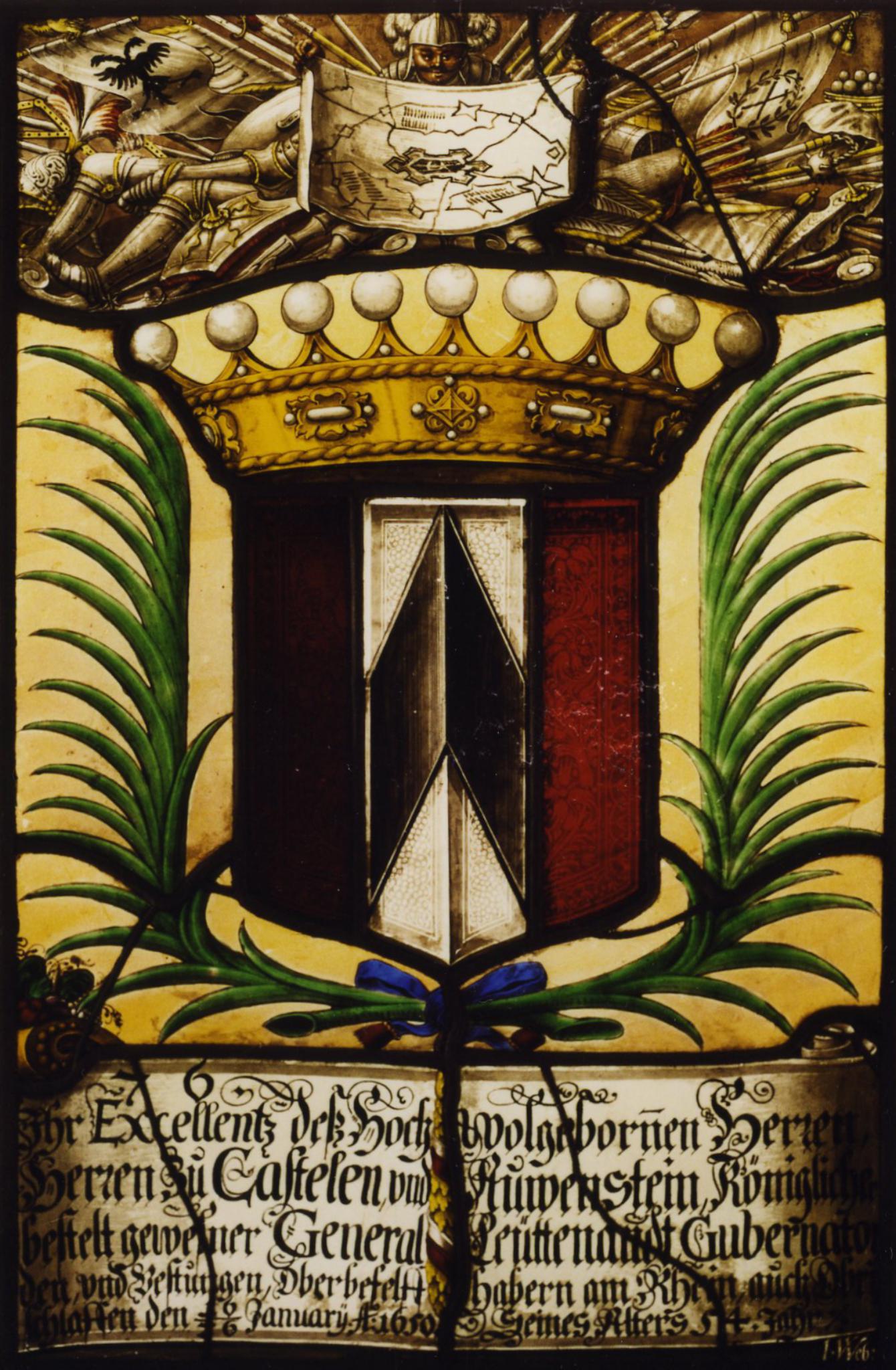 {Anno 16} 76 / {Zů HochEhren Lobrüemlichen Angedencken} Ihr Excellentz deß hochwolgebornen Herren / {Herren Johan Lůdwigen von Erlach} Herren zů Castelen vnd Aůwenstein Königlicher / {Maÿestätt zů Franckrich bey dero Kriegsherren wol} bestelt gewesner General Leüttenandt Gubernator / {der vestung Breÿsach vnd selber weiters Anhengiger Lan} den vnd Vestungen Oberbefeltthabern am Rhein aůch Obri / {ster zů pferdt vnd zů fůes der ist in Breÿsach Selig in Gott endt} schlaffen den 16/26 Januarÿ Ao: 1650 seines Alters 54 Jahr / I. Web. (in Klammern der Textteil auf dem Gegenstück).