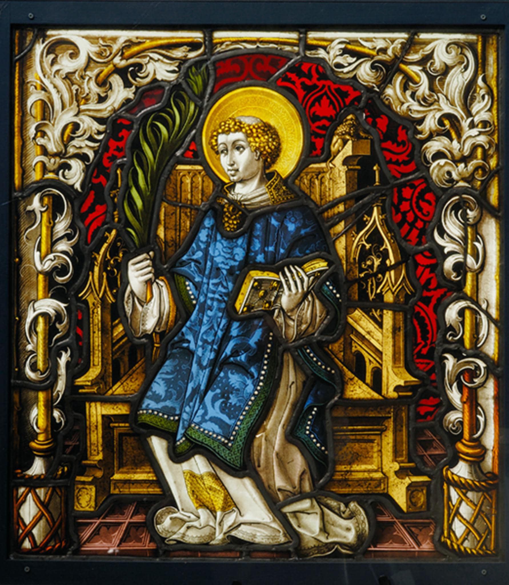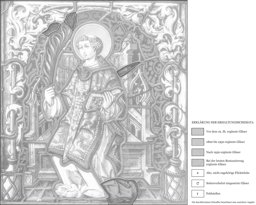 Der hl. Vinzenz sitzt vor rotem Damastgrund auf einem kunstvoll geschnitzten, auf rosa Fliesenboden stehenden gotischen Thron. Er ist in eine Alba und eine blaue, prächtig gemusterte Dalmatika gekleidet. In seiner rechten Hand hält der Heilige den Palmzweig und in der anderen ein Buch. Gerahmt wird er von einem gelben Astbogen, aus dem Blätter wachsen.