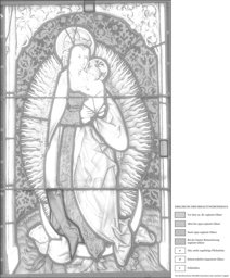 Ein Stück im Madonnenmantel und das Scheitelstück im Bogen alt ergänzt; ein kleines Glas im rechten Pfeiler neu ergänzt; einige kleine Sprünge und Sprungbleie; die Verbleiung erneuert.