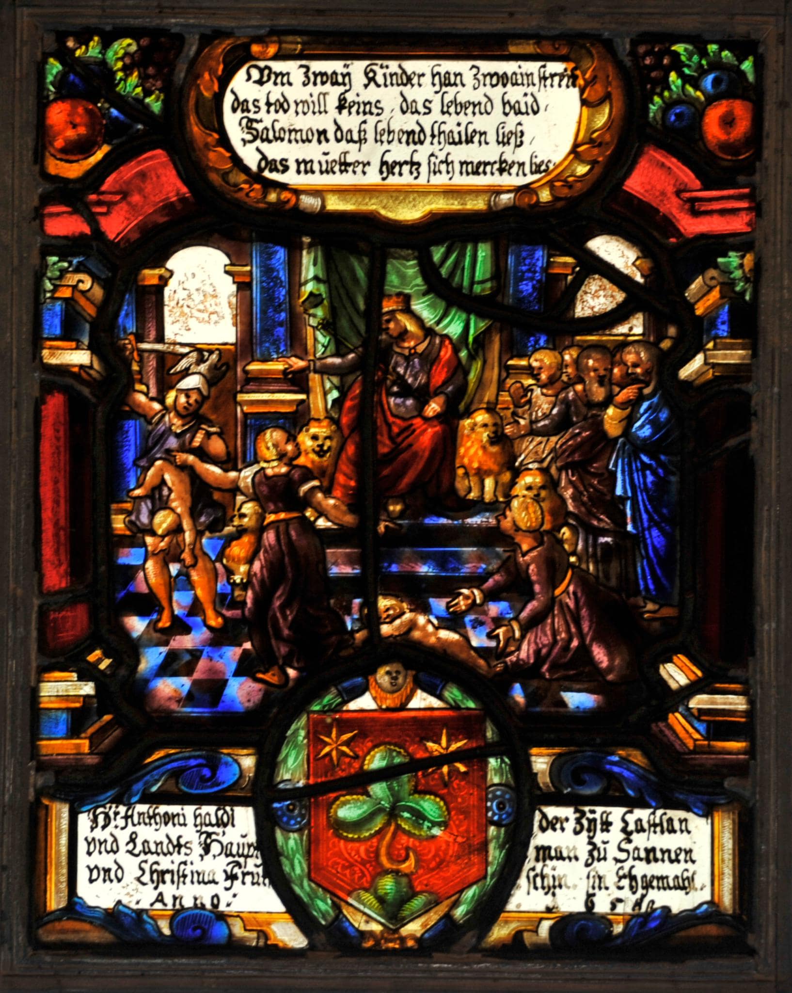 Das Glasgemälde schildert das Urteil Salomons (1 Kg 3, 16ff.). Im Palastsaal auf seinem Löwenthron sitzend, befiehlt der weise König in Anwesenheit der beiden streitenden Frauen dem vor ihm stehenden Soldaten, das von ihm gehaltene lebende Kind zweizuteilen. Für diese Darstellung benutzte Matthias Zwirn als Vorlage den Kupferstich aus Matthäus Merians Bilderbibel. Gerahmt wird das Figurenbild durch eine rote Arkade, an deren Flachbogen die Bildlegende in einer Kartusche angebracht ist. Die Stifterinschrift und das oval umkränzte Stifterwappen sind am Scheibenfuss platziert.
