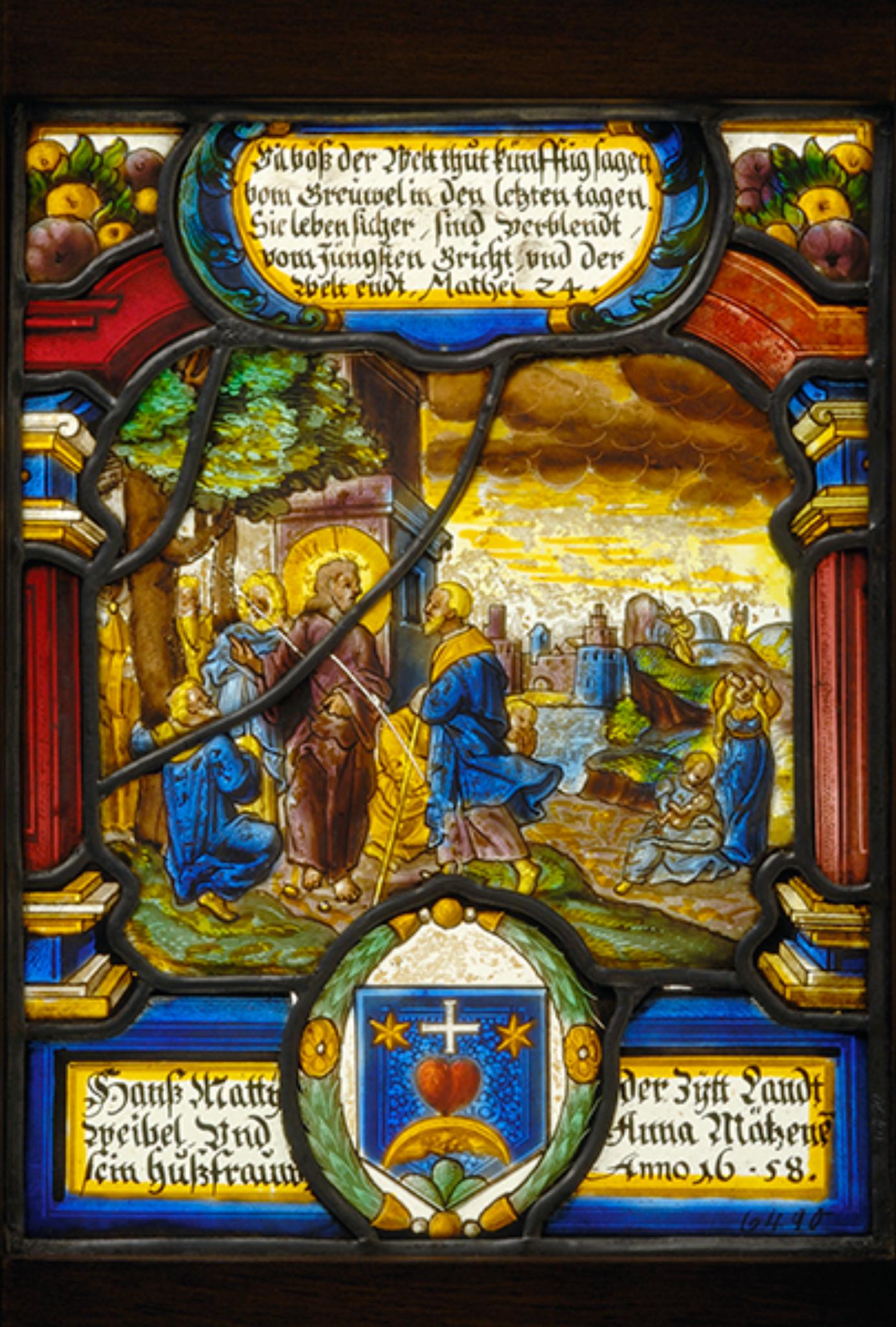 Im Hauptbild erscheint Christus, der unter einem Baum seinen Jüngern die Endzeit predigt (Matth. 24). Im Hintergrund ist eine Ansicht Jerusalems zu sehen. Die Figurenszene rahmt eine Arkade aus roten Pfeilern und einem roten Flachbogen. An dessen Scheitel befindet sich die Bildlegende in einer grossen blauen Rollwerkkartusche. Den Scheibenfuss füllt eine blau gerahmte Tafel mit der Stifterinschrift. Ihr zentral aufgesetzt ist das oval umkränzte Wappen von Hans Matti.