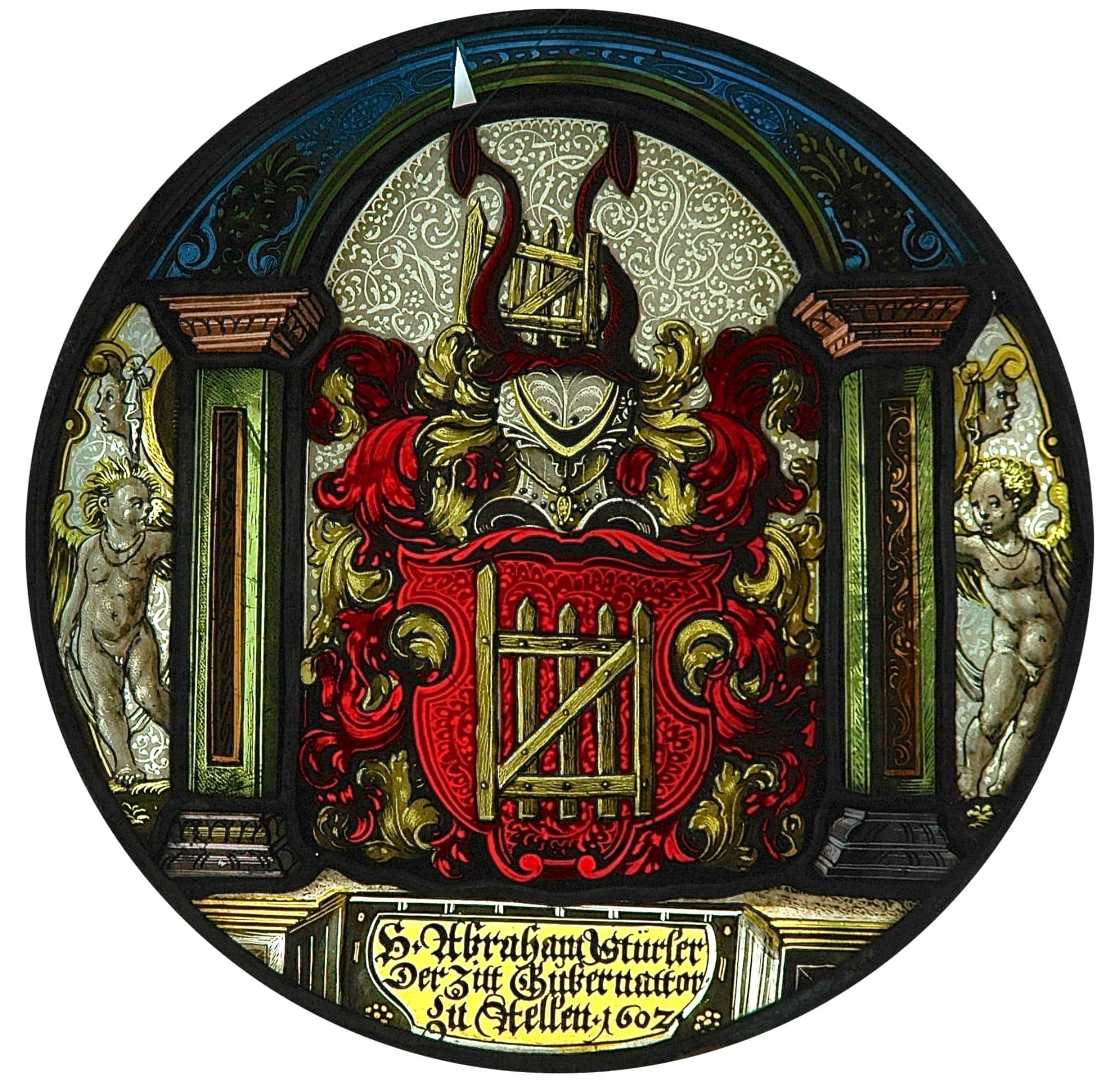 Abraham Stürler (erstmals erwähnt 1584–1624), Sohn des Kleinrats Gilian Egidius Stürler und der Anna von Mülinen, gelangte 1585 in den Grossrat von Bern. Er amtete 1588–1594 als Vogt von Oron, stieg 1595 in den Kleinen Rat auf, war 1597–1603 Gubernator zu Aelen (Aigle), 1603–1607 Venner zu Gerbern, 1610–1624 Welschseckelmeister sowie häufig Gesandter. Der erfahrene Politiker besass ein beträchtliches Vermögen, ein Haus in der Kramgasse und einen Landsitz in Gampelen. Schon 1584 hatte Abraham in Bern die 14jährige Agatha Wurstemberger († 1623) geehelicht, die Tochter des Kleinrats Simon Wurstemberger und der Barbara von Graffenried. Sie schenkte ihm zahlreiche Kinder, darunter sechs Söhne, von denen jeder einen Familienzweig begründete. Von diesen kennt man ebenfalls Scheibenstiftungen, so von Kilian (Gilian) eine von 1615 (Bernisches Historisches Museum, Inv. 14671) sowie von Johannes eine von 1640, die 1678 erneuert wurde (BHM Bern, Inv. 14669). Das Bernische Historische Museum bewahrt ein in Öl gemaltes Bildnis Abraham Stürlers (Stürler 1933; HBLS 6/1931, S. 587, mit Abb.; HLS 12/2013, S. 101). Von Abraham Stürler selbst gibt es ein Glasgemälde von 1601 im Bernischen Historischen Museum (BHM Bern, Inv. 14668) sowie eine runde Wappenscheibe von 1602 in Berner Privatbesitz (BE_1402).