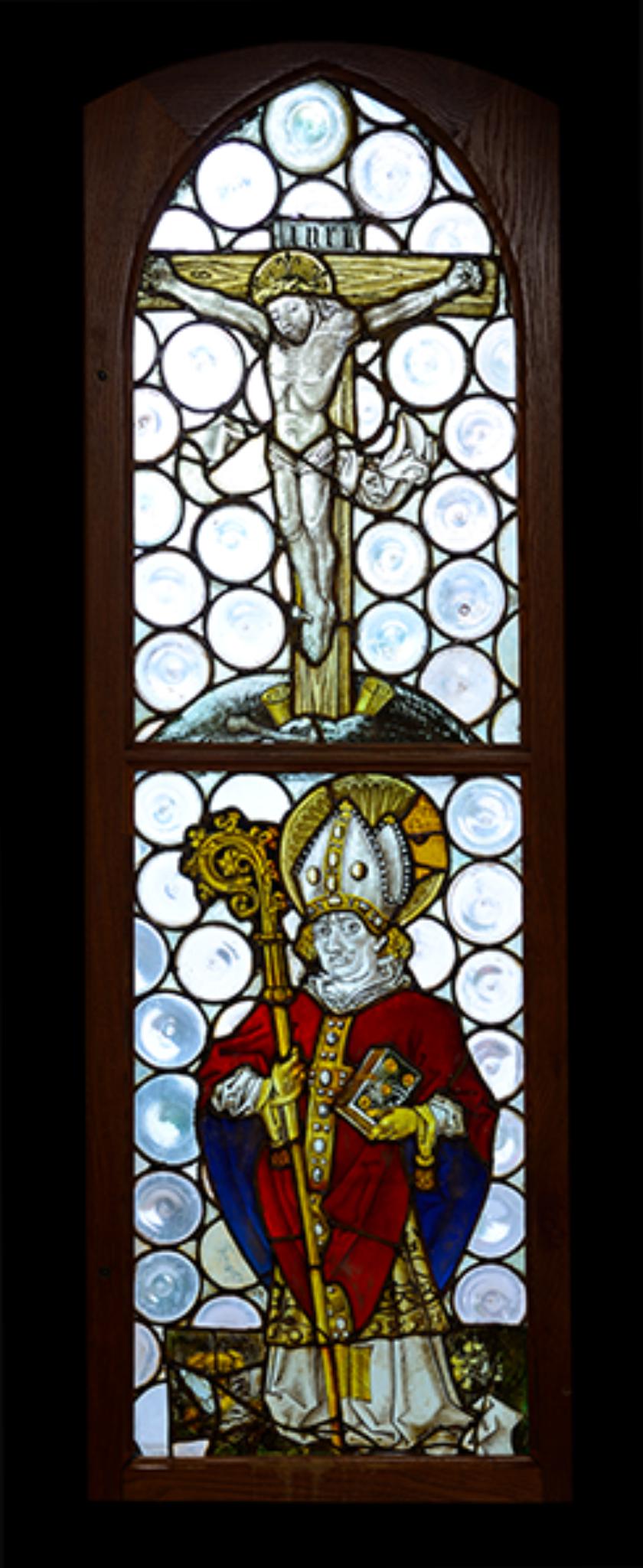 Das Kirchen- oder Kapellenfenster aus Butzenscheiben zeigt im oberen Feld den Gekreuzigten: Christus hängt im Dreinageltypus an den Balken des Kreuzes, das mit Keilen in einer Rasenscholle verankert ist und dessen senkrechter oberer Abschluss durch das INRI-Schriftband verdeckt wird. Ein Knochen weist auf das Grab Adams hin. Im unteren Fensterfeld steht ein hl. Bischof in Pontifikalkleidung auf einem Rasenboden. Seine rote, blaugefütterte Kasel bildet neben dem Silbergelb den einzigen farbigen Akzent der Darstellung. Buch und Krummstab sind dem Heiligen beigegeben, aber keine individuellen Attribute.