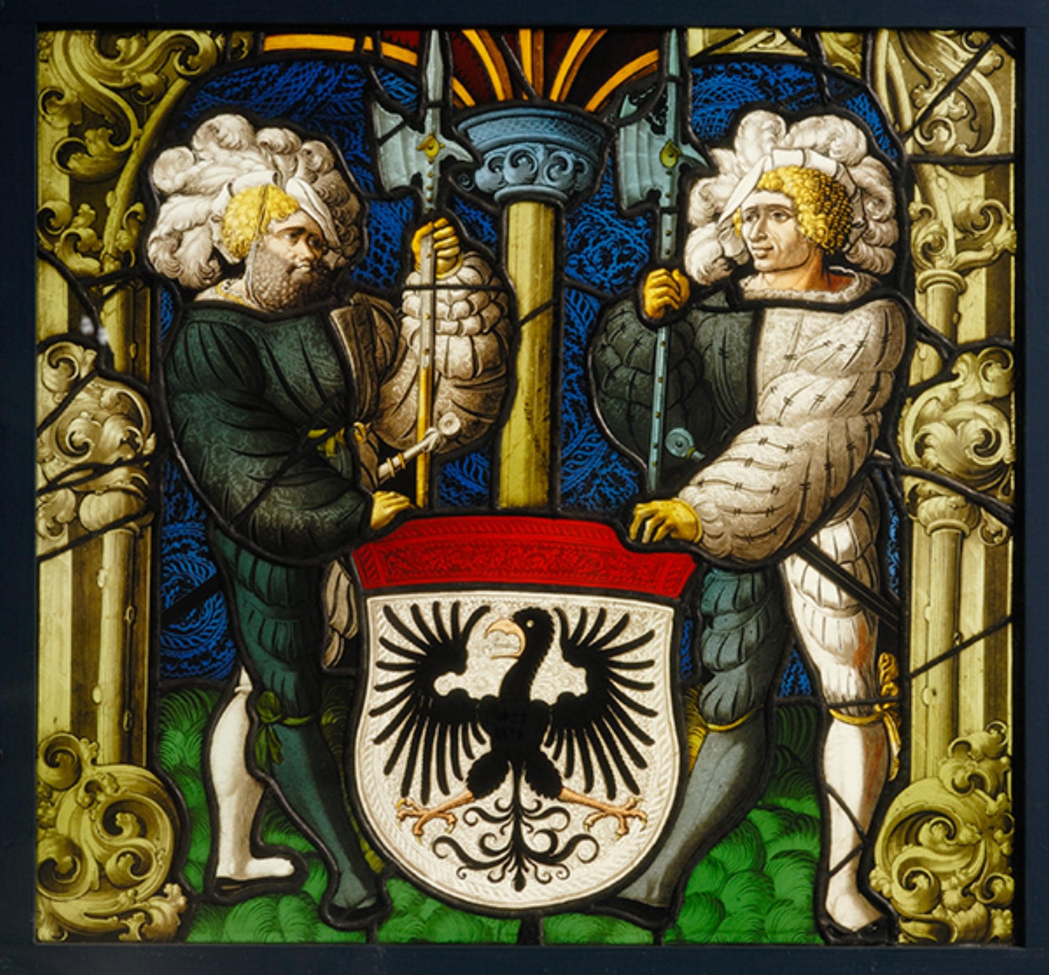 Vor blauem Hobelspandamast ist das Wappen der Stadt Aarau auf den grünen Wiesengrund gesetzt. Gehalten wird es von zwei blondgelockten Halbartieren mit weissem Federbarett sowie in weisser und stahlblauer bzw. graugrüner Miparti-Kleidung. Den Rahmen bilden zwei äussere, vor Pilaster gestellte grünlichgelbe Astsäulen mit Blattdekor sowie eine schmucklose Mittelsäule gleicher Farbe mit stahlblauem Kapitell. Aus diesem steigen fünf rotgoldene Rippen auf, die das tiefrot gehaltene Gewölbe unterteilen.