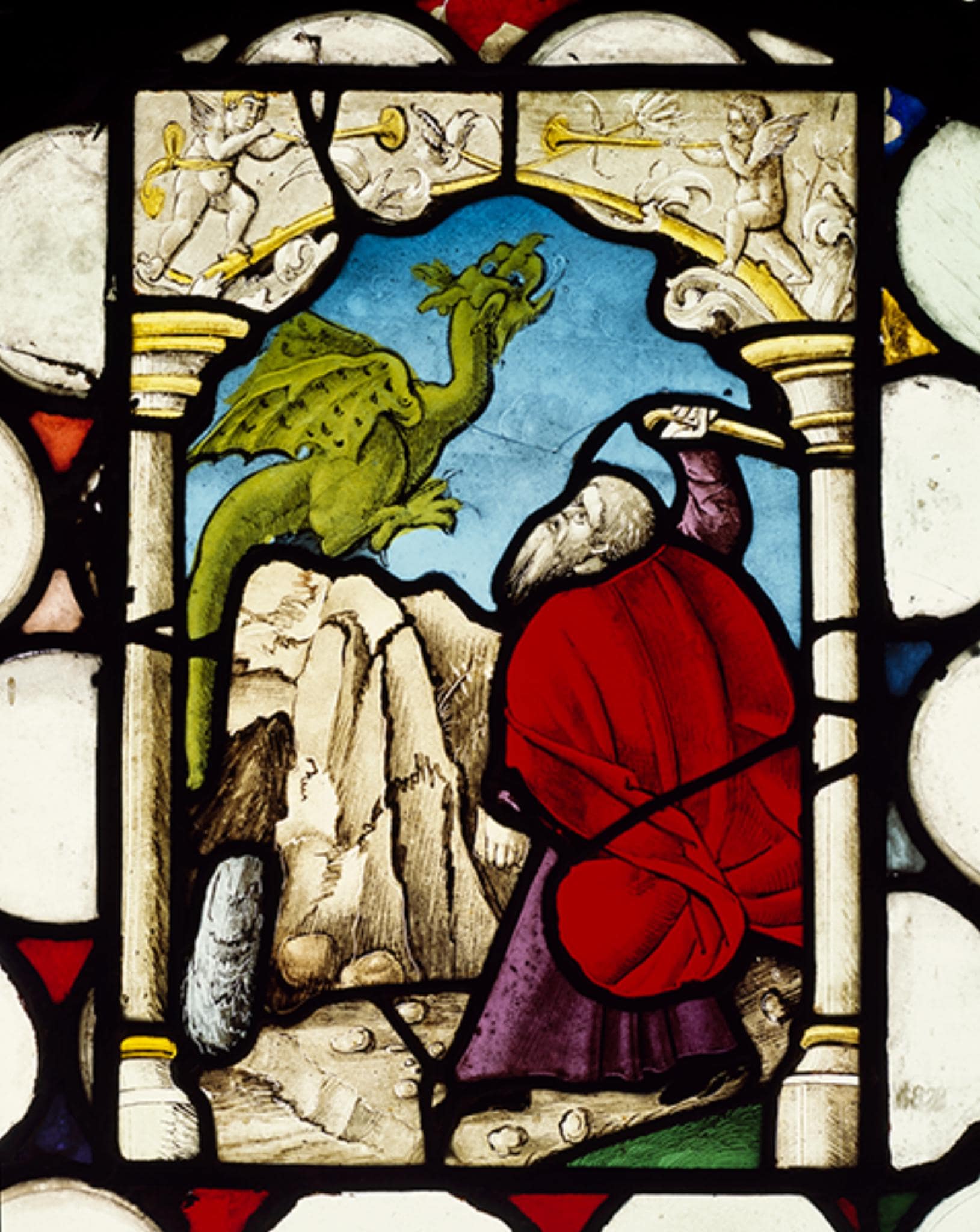 Die in ein rundbogiges Butzenfenster eingefügte Bildscheibe zeigt den hl. Beatus bei der Vertreibung des Drachen aus seiner Höhle beim Beatenberg. In ein langes violettes Gewand und einen roten Mantel gehüllt, schlägt der weissbärtige Heilige furchtlos mit seinem Stab auf den Drachen ein, der über die felsige Anhöhe aufsteigt. Die Szene rahmen zwei Steinsäulen und ein gelber Astbogen, auf dem sich zwei hornblasende Putten befinden.