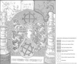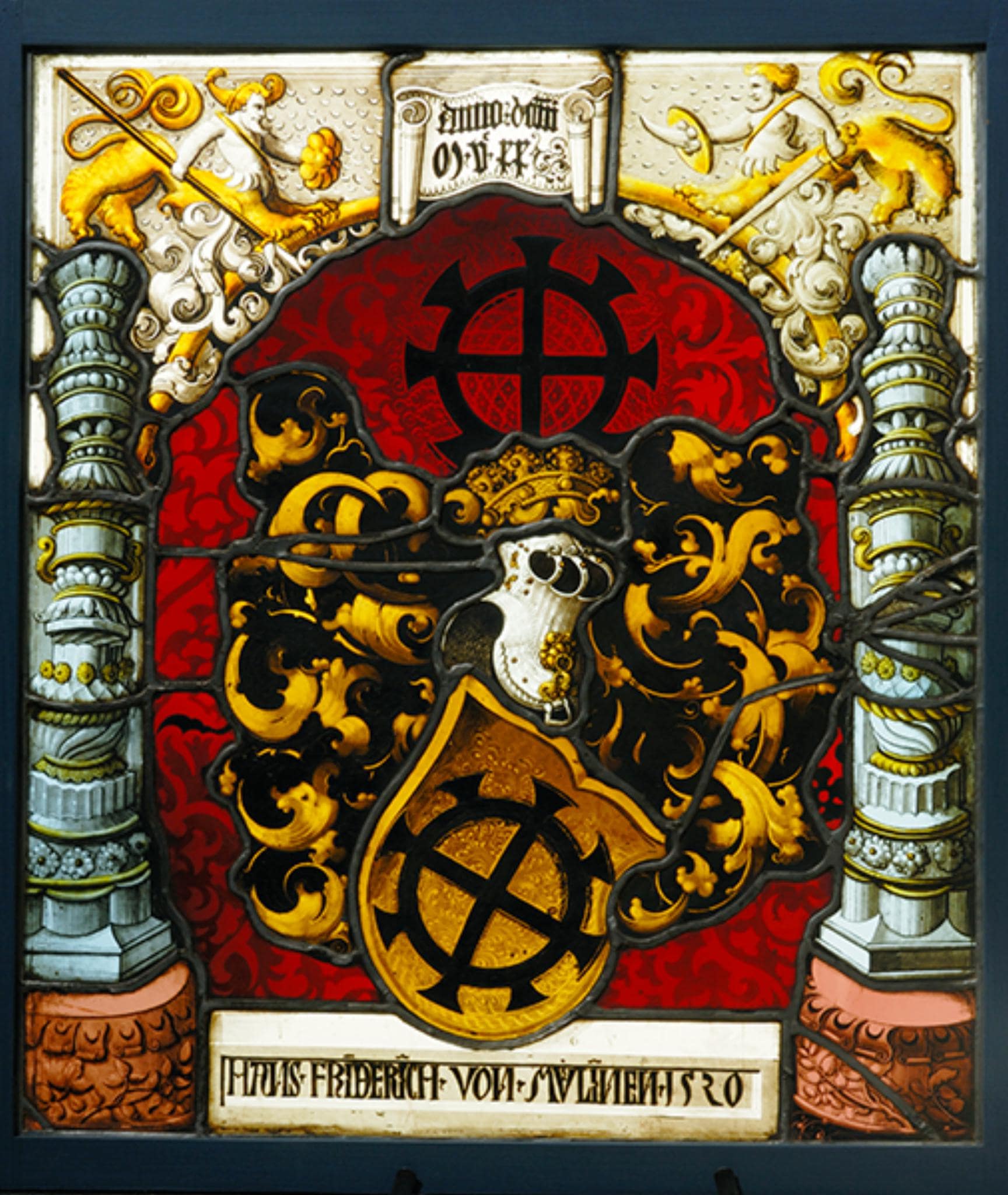 Die Scheibe zeigt das vor rotem Damastgrund auf dem beschrifteten, schmucklosen Sockel stehende Vollwappen Hans Friedrich von Mülinens. Gerahmt wird es von zwei bizarr anmutenden, kandelaberartigen hellblauen Säulen, die auf rosa Sockeln ruhen. Dazwischen spannt sich ein mit Blättern geschmückter gelber Astbogen, dessen Scheitel ein das Stiftungsjahr enthaltendes Schriftband ziert. Säule und Bogen daneben sind mit zwei kämpfenden Fabelwesen besetzt.