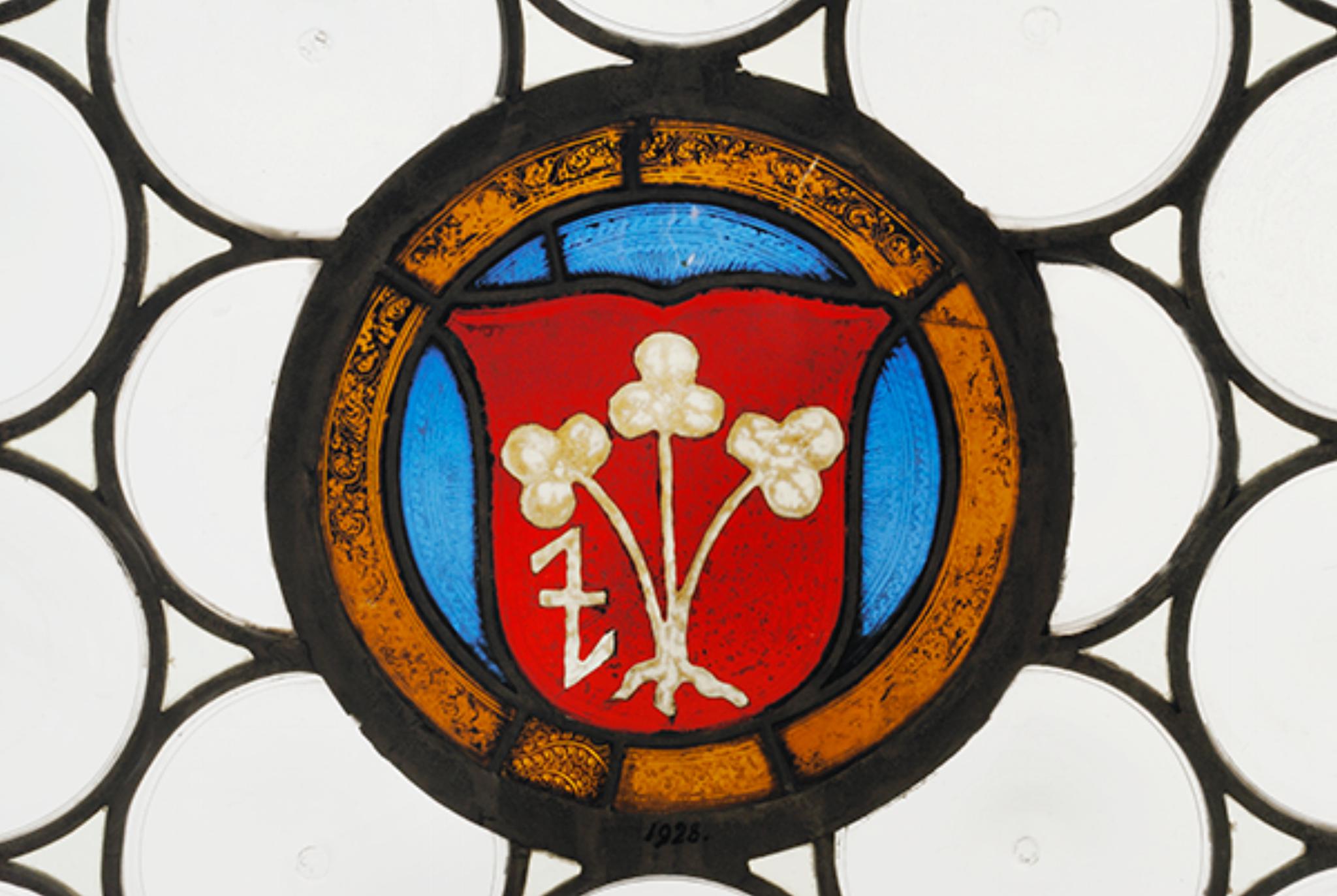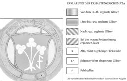 Vor blauen Grund ist ein unbekanntes Wappen (Zigerli?) gesetzt. Es wird von einer feinen, bräunlichgelben Rankenbordüre umfasst, die aus der Schwarzlotlasur radiert wurde.