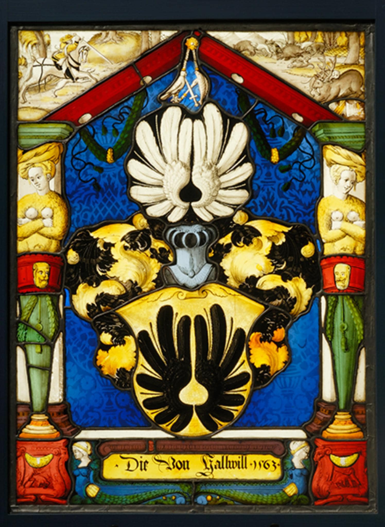 Vor blauem Damastgrund steht das Vollwappen der Familie von Hallwyl. Über seiner Helmzier ist am roten Giebel das Ordensemblem vom Fisch und Falken aufgehängt. Dieser Giebel fusst auf zwei Pfeilern mit hermenförmigen Karyatiden in Gestalt von Wildfrauen. Das Oberbild zeigt Reiter und Hund bei der Hirsch- und Eberjagd. Die Stifterinschrift befindet sich am büstengeschmuckten Podium.