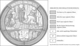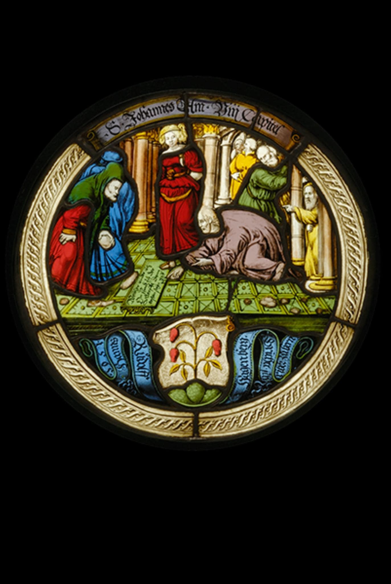 Dargestellt ist die im Evangelium des Johannes geschilderte Begebenheit von Christus und der Ehebrecherin (Joh. 8, 3–11). Ort des Geschehens bildet der Tempel, der hier durch die im Hintergrund der Figuren sichtbaren Säulenreihen verdeutlicht wird. In roter Kleidung und mit gefesselten Händen steht darin im Zentrum die des Ehebruchs angeklagte Frau. Neben ihr hat sich Christus in hellviolettem Mantel auf den grün gefliesten Tempelboden niedergelassen, um in einer Tafel seine Worte niederzuschreiben, mit denen er die um ihn versammelten Pharisäer und Schriftgelehrten von der Steinigung der Angeklagten abhält. Von ihrem Ansinnen ablassend, sind diese bereits daran, die Steine aus ihren Händen zu nehmen und sich aus dem Staub zu machen. Unter der Figurenszene befindet sich zwischen dem hellblauen Schriftband mit dem Namen des Stifters das Wappen von Hans Rudolf Hagenberg. Die ganze Komposition umschliesst ein farbloses Ornamentband. Unterbrochen wird dieses durch die oben eingefügte violette Schriftrolle mit Angabe der entsprechenden Bibelstelle.