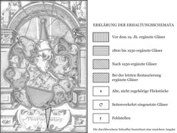 Eine farblose neue Ergänzung in der Schriftkartusche (die letzte Ziffer der Jahreszahl dadurch unklar: eventuell "9"?); zwei kleine alte Flickstücke im Damast bzw. im rechten Pfeilerkapitell; zahlreiche Sprungbleie; die Verbleiung erneuert.