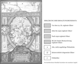 Die Gläser am Scheibenfuss (Inschriftenkartusche mit Engelköpfen) neu ergänzt; das Oberbild mit der roten Bordüre darunter alt eingeflickt; ein Sprung; Sprungbleie, die Verbleiung erneuert.