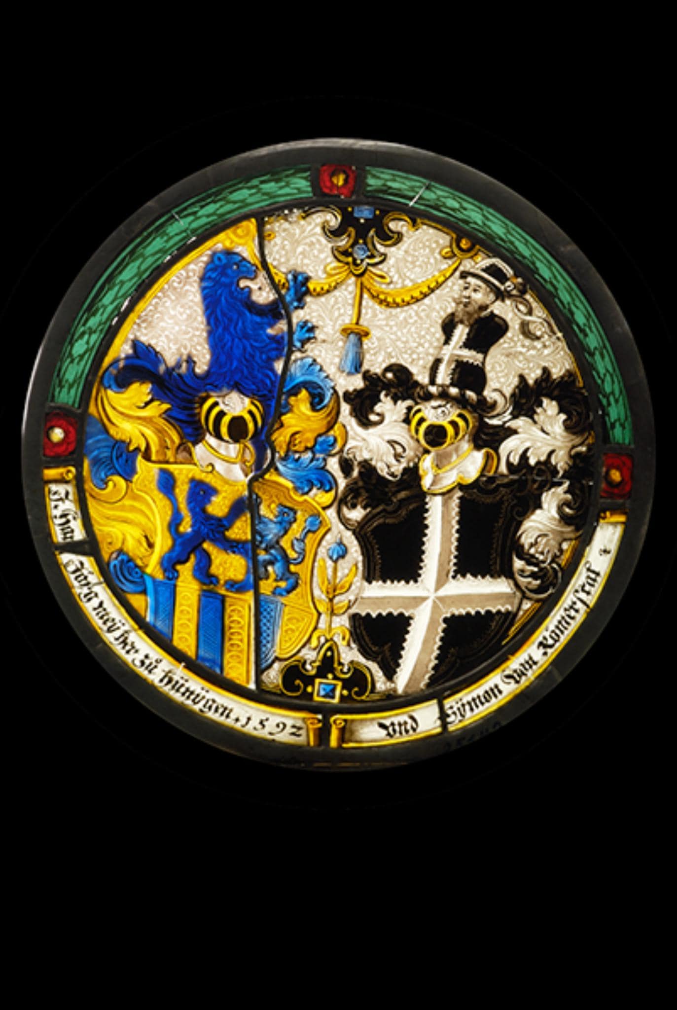 Die Rundscheibe zeigt die Vollwappen des Hans Jörg (Georg) May und des Simon von Römerstal vor weissem Federdamast. Die durch rote Rosetten unterteilte Aussenbordüre besteht im oberen Teil aus einem grünen Lorbeerkranz und im unteren aus zwei Schriftrollen mit den Stifternamen.