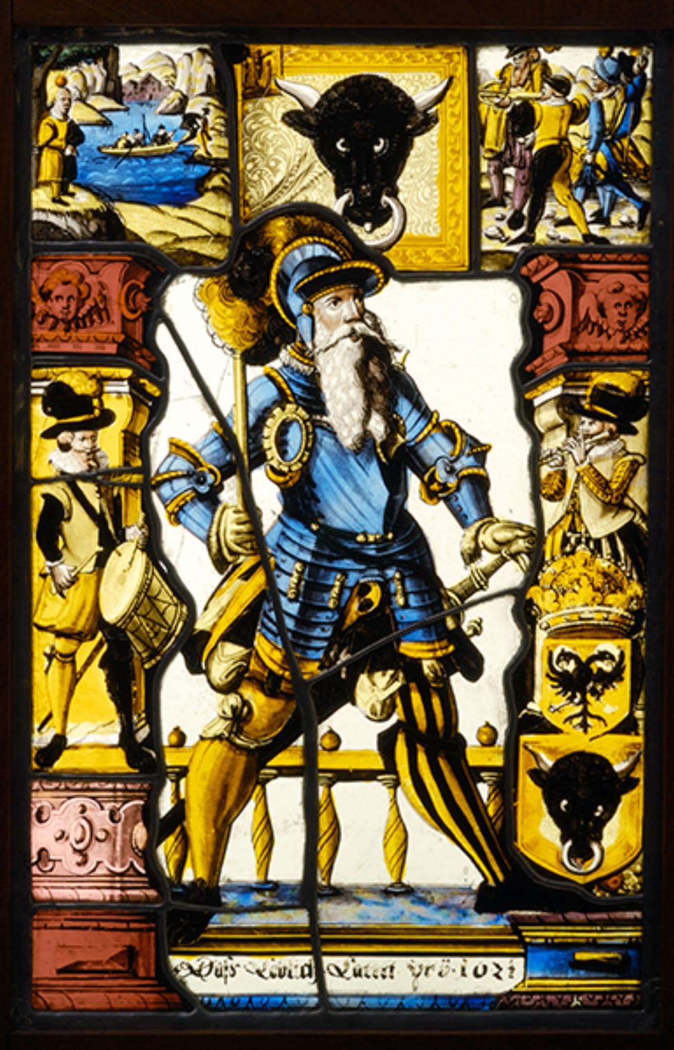 Vor farblosem Grund und einer gelben Balustrade steht der Urner Bannerträger breitbeinig auf dem beschrifteten, marmorierten Podium. Er trägt einen hellblauen Halbharnisch sowie Strümpfe in den Miparti-Farben Gelb und von Gelb und Schwarz gestreift. Die Seitenrahmung bilden gelbe Pfeiler mit roten Kapitellen, vor denen, in den Urner Landesfarben gekleidet, links ein Trommler sowie rechts ein Pfeifer zusammen mit dem vom bekrönten Reichsschild überhöhten Wappen Uris dargestellt sind. Im Oberbild ist Tell beim Apfelschuss und links im Hintergrund beim Sprung aus Gesslers Schiff festgehalten.