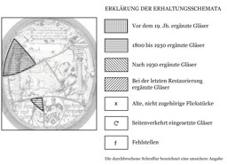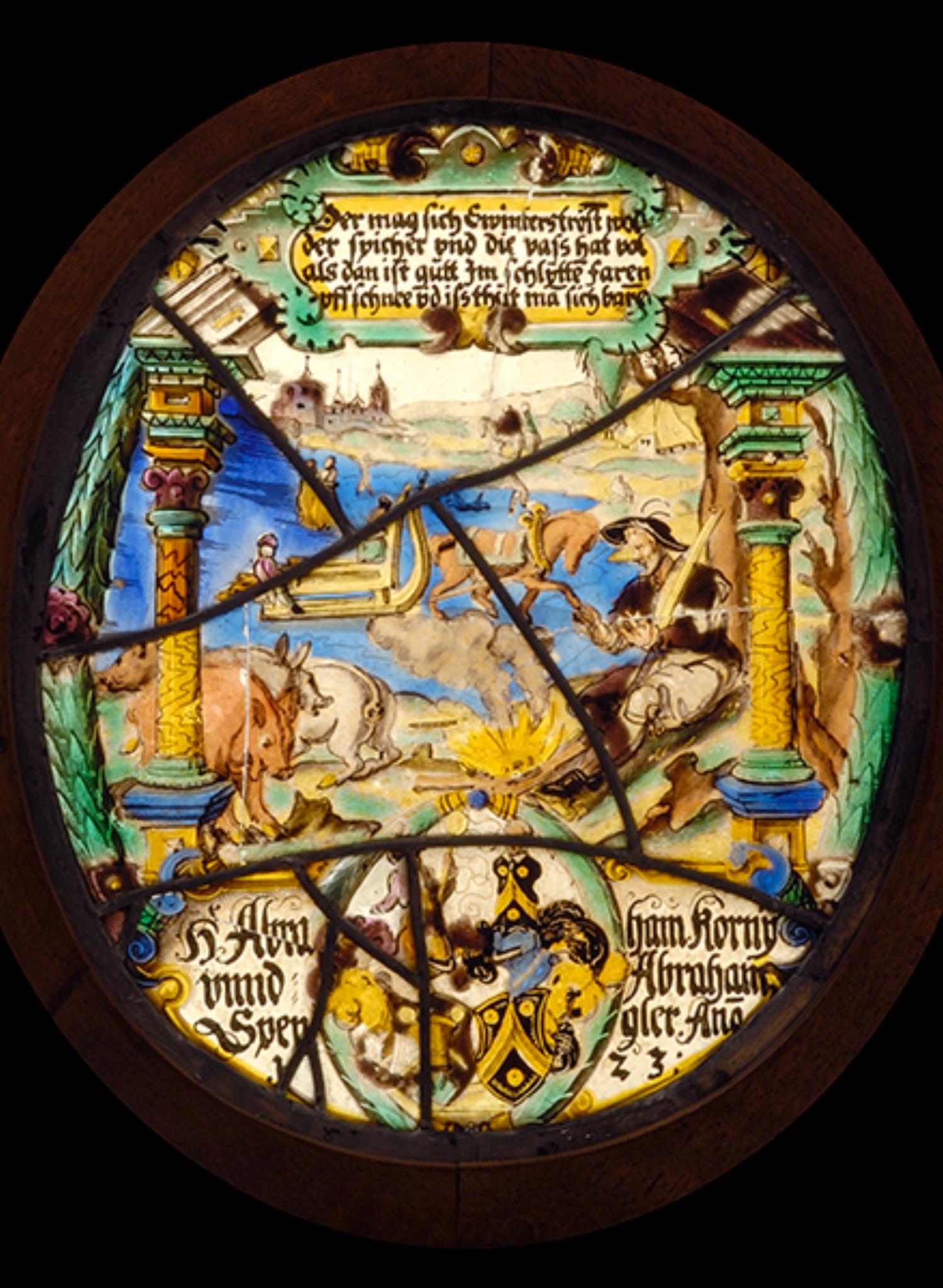 Die Ovalscheibe zeigt Sinnbilder des Winters in einer Landschaftsszenerie mit gefrorenem See. An dessen Ufer sitzt ein sich am Feuer wärmender Mann. Vor ihm befinden sich drei Schweine, die er sich als "Wintervorrat" hält. Auf dem See sind ein von einem Pferd gezogener Schlitten sowie ein Liebspaar zu sehen. In die Landschaft gesetzt ist eine breite, die Hauptfiguren umfassende Säulenarkade, an deren Bogen der die Darstellung erläuternde Vers in einer grossen grünen Kartusche prangt. In der Fusszone enthält die seitlich von Lorbeerzweigen umkränzte Scheibe die Kartusche mit der Stifterinschrift sowie in einem Ovalkranz die Vollwappen von Abraham Korni und Abraham Spengler.