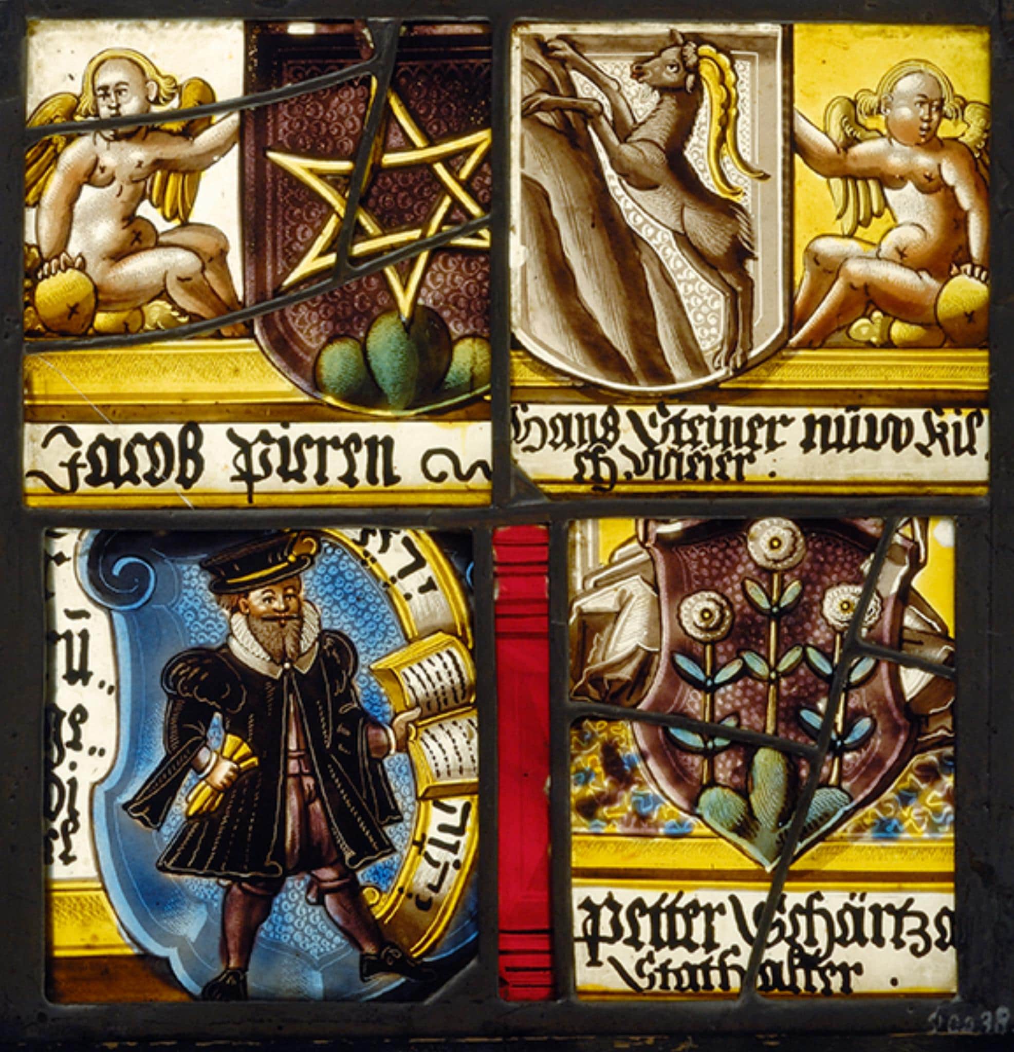 Im Scheibchen sind mehrere Fragmente zusammengefasst, wovon die meisten ein Wappen mit Stifternamen enthalten. Bei Jakob Pieren handelt es sich wohl um jenen Jakob Pieren (* 1580) aus Frutigen-Kandersteg, der 1623 zusammen mit seiner Ehefrau Magdalena Hauswirt eine Scheibe in die Siechenhauskapelle von Bern stiftete. Diese im Bernischen Historischen Museum befindliche Scheibe (BE_266) stammt wie vermutlich der Grossteil der vorliegenden Fragmente vom Thuner Glasmaler Kaspar Lohner. Der als Statthalter genannte Peter Scherz gab 1593 wahrscheinlich als Weibel zu Adelboden eine Scheibe in Auftrag. Diese ist heute zerstört, aber durch eine Fotografie im Bernischen Historischen Museum dokumentiert (BHM Bern, Foto 4219).
