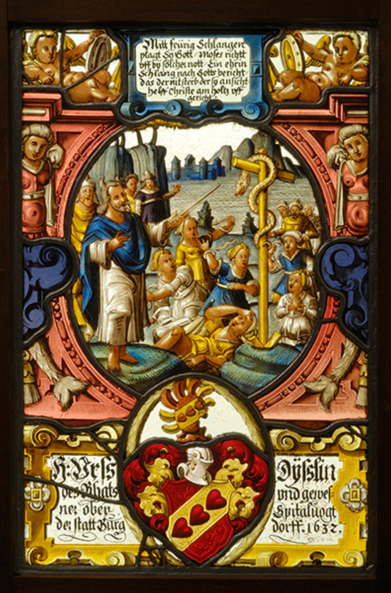 Die vier Scheiben im Bernischen Historischen Museum (BHM Bern, Inv. 14898–14901) gehören zu einem Zyklus, der laut Sammlungsbericht des Museums aus Lützelflüh stammen soll, das im Emmental zwischen Langnau und Burgdorf gelegen ist (Jahrbuch BHM Bern 1922). Wie viele Scheiben ehemals zu dieser Serie gehörten, ist nur schwer abzuschätzen. Sie dürften aus Gründen der Bandbreite der Szenen recht zahlreich gewesen sein und wahrscheinlich aus einem kirchlichen Kontext stammen. Es ist zudem anzunehmen, dass die Bilder des Alten Testaments solchen des Neuen gegenüberstanden. So ist die Aufrichtung der Ehernen Schlange eine Präfiguration der Kreuzigung Christi (nicht erhalten), denn wie die Israeliten beim Blick auf die eherne Schlange Heilung erfuhren, so brachte der Gekreuzigte den christlichen Gläubigen die Erlösung.