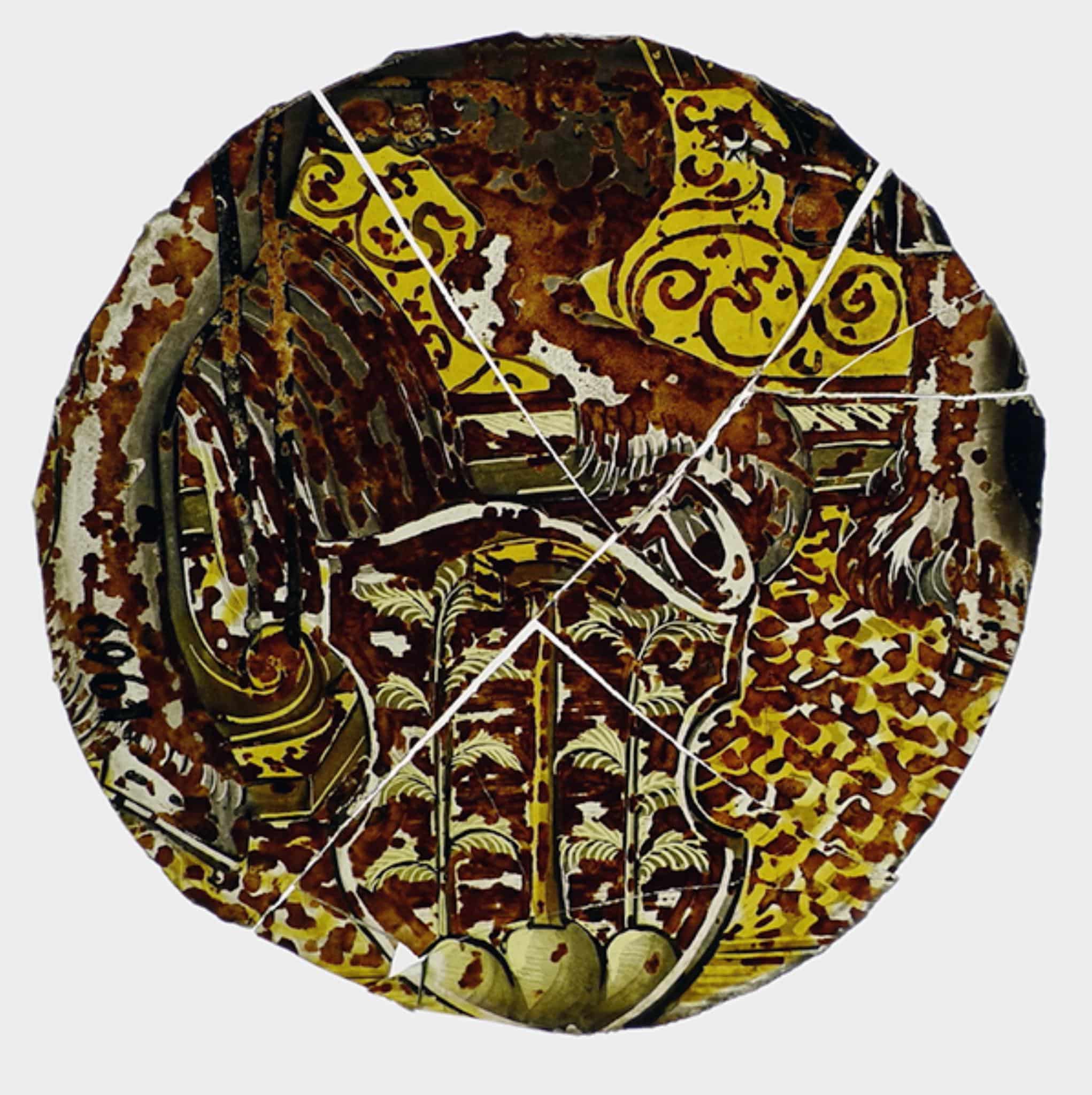 Das Scheibchen, das – rund zugeschnitten – heute nur noch ein Fragment darstellt, muss entweder zu einer Willkommscheibe ergänzt werden, in der dem Stifter zu Pferd seine Frau mit dem Willkommbecher entgegentrat, oder zu einer Wappenscheibe zweier befreundeter Scheibenstifter, die auf Pferden aufeinander zuritten. In dieser Form komponierte Glasgemälde oder Scheibenrisse sind gerade aus Bern mehrfach bekannt (Hasler 1996/97, Bd. 1, Kat.-Nr. 273; Bd. 2, Kat.-Nr. 390; Willkommscheibe Welti Moser 1606 im BHM Bern, Inv. 8881). Auch die Begegnung eines berittenen und eines stehenden Kriegers könnte das ehemalige Mittelbild der Scheibe gezeigt haben (Hasler 1996/97, B. 2, Kat.-Nr. 391). Als Inspiration oder Vorbild diente dem unbekannten Glasmaler wohl ein Stich aus dem Pferde- und Turnierbuch (Frankfurt, Feyerabend 1584) oder aus dem Wappen- und Stammbuch Jost Ammans (Frankfurt, Feyerabend 1589). Dessen Pferdedarstellungen ähneln in Haltung und Anatomie dem Pferdekörper auf der Scheibe in hohem Masse (vgl. Amman's Wappen- & Stammbuch 1923, S. 65, 69, 105; Pferde und Turnierbuch, S. XLI). Das Wappen des ehemaligen Scheibenstifters liess sich bislang nicht auflösen.