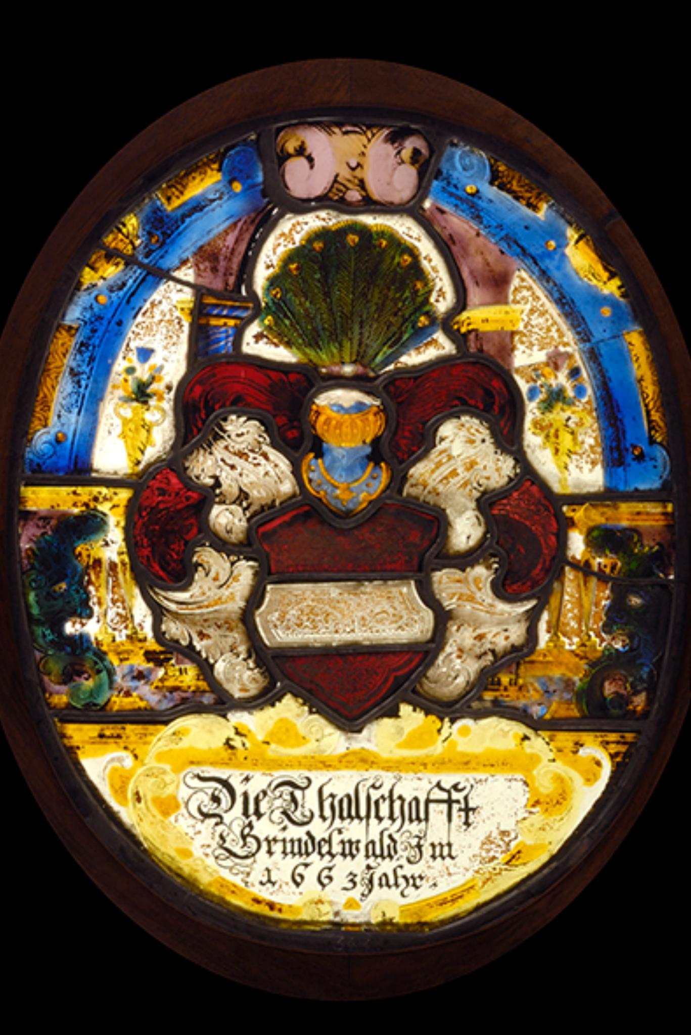 Über der gelben Blatt- und Rollwerkkartusche mit der Stifterinschrift erhebt sich das Vollwappen der Talschaft Grindelwald. Es steht vor einer violetten Arkade und einer Balustrade, auf der sich zwei Blumenvasen befinden. Seine obere Hälfte umfasst eine blaue Rollwerkbordüre mit zentraler, hellvioletter Kartusche.