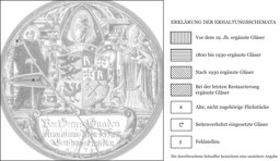 Die runde Monolithscheibe stellt das über die Rollwerkkartusche mit dem Stifternamen gesetzte Wappen des Fürstabtes Augustin II. Reding zu Einsiedeln dar. Der sich vor einer mehrachsigen Architektur erhebende Wappenschild wird von der mit der Mondsichelmadonna dekorierten und mit dem Pedum durchsteckten Mitra überhöht. Daneben steht als Schildbegleiter links der hl. Meinrad in Tonsur und schwarzem Mönchshabit. Der Heilige, aus dessen Einsiedlerzelle im Finsternwald das Kloster Einsiedeln hervorging, erscheint mit seinen traditionellen Attributen, Krug, Brot und Keule. Auf der Gegenseite befindet sich der hl. Augustinus in Pontifikaltracht. Er hält in der einen Hand das Pedum und in den andern auf einem Buch das pfeildurchbohrte Herz als Symbol seiner feurigen Gottesliebe. Der vor ihm sitzende nackte Knabe mit dem Löffel in der Hand erinnert an die Legende, wonach Augustinus einmal einen mit einem Löffel Wasser aus dem Meer schöpfenden kleinen Knaben fragte, was er täte. Darauf soll dieser geantwortet haben: "Das gleiche, was du tust! Du willst die Unergründlichkeit Gottes mit deinen Gedanken ausschöpfen – ich versuche das Meer auszuschöpfen!"