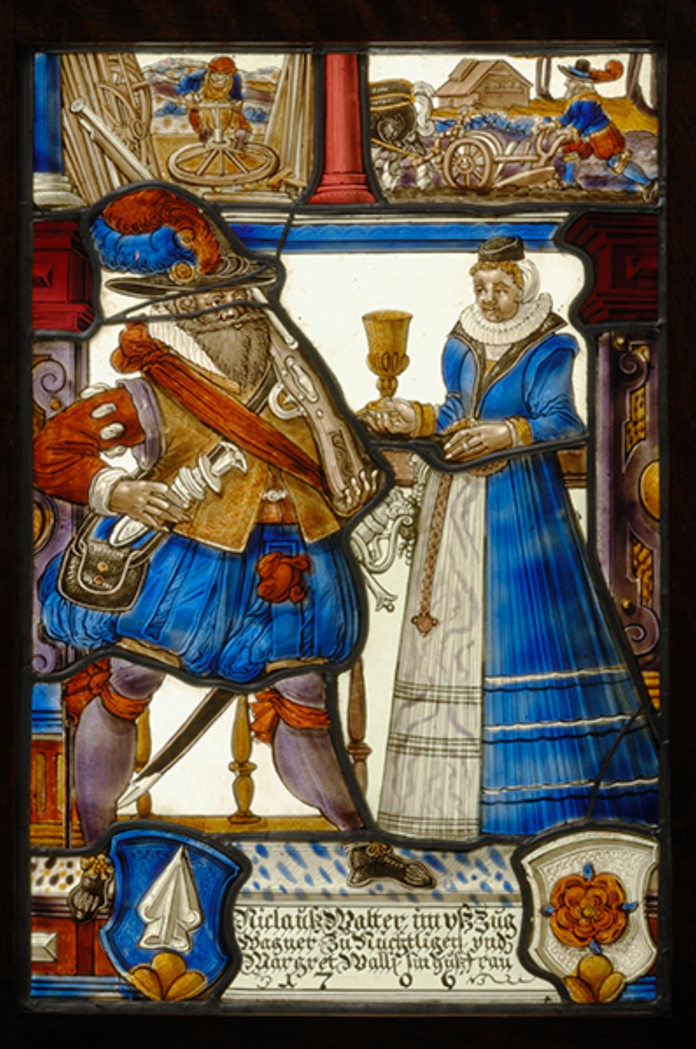 Vor einer Balustrade stehen Niklaus Walter (Walther) und seine Frau auf dem kleinen Podium, an dessen Front ihre Namen zwischen den beiden Stifterwappen angebracht sind. Der schwertbewaffnete, bärtige Stifter hat seine Büchse geschultert und hält in seiner Rechten den Schweizerdolch. Er ist in ein kurzärmeliges Lederwams, ein rotes Hemd, blaue Pluderhosen, violette Strümpfe und einen schwarzen Federhut gekleidet. Zudem hat er um die Brust eine rote Schärpe und eine kleine Tasche gebunden. Seine Gattin reicht ihm in der Rechten den Pokal mit dem Willkommenstrunk. Sie erscheint in langem blauem Gewand, weisser Schürze und einem kleinem Barett. Die Figuren rahmen seitlich violette Pfeiler, deren rote Kapitelle durch ein blaues Gebälk miteinander verbunden sind. In dem durch die rote Mittelsäule in zwei Felder unterteilten Oberbild ist links ein Wagner bei der Arbeit und rechts ein Bauer beim Pflügen auf dem Feld bei seinem Hof zu sehen.