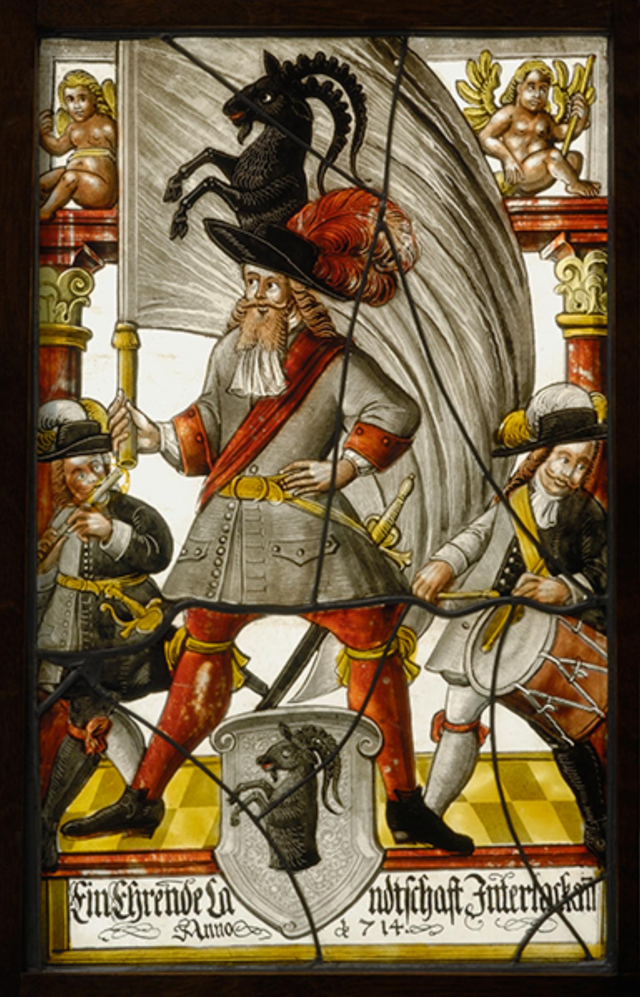 Im Zentrum steht auf gelb gefliestem Boden der bärtige Bannerträger der Landschaft Interlaken. Er trägt die Uniform der damaligen Landmiliz, d. h. ein hellgraues Wams mit roter Schärpe, rote Strümpfe und auf dem Haupt einen schwarzen Federhut. Sein Schwert am Gürtel festgebunden, hält er in der Rechten das geblähte Banner seiner Landschaft. Er wird von einem Trommler und Pfeifer begleitet, deren Kleidung in den Mi-parti-Farben Schwarz und Grau gehalten ist. Das Landschaftswappen Interlakens zu den Füssen des Bannerträgers steht im Zentrum der am Sockel angebrachten Inschrift. Auf dem von roten Säulen getragenen roten Gebälk sitzen zwei nackte Putten.