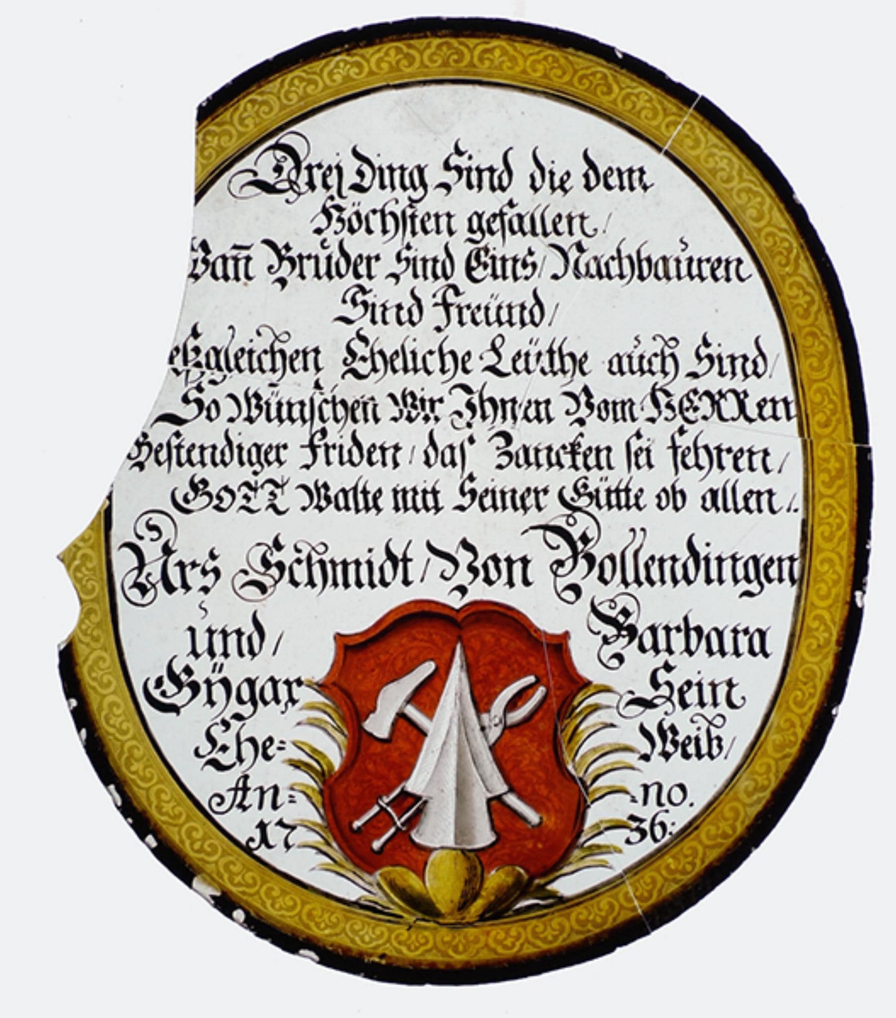 Drej Ding Sind die dem / Höchsten gefallen / [W]an Bru[e]der Sind Eins Nachbauren / Sind Freünd / [D]eβgleichen Eheliche Leüthe auch Sind / So Wünschen Wir Jhnen Vom HERRen / Bestendiger Friden das Zancken sei fehren / GOTT Walte mit Seiner Gütte ob allen.