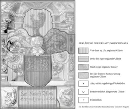 Der in der Inschrift genannte Stifter, Karl Rudolf May von Rued, liess 1751 in die vorliegende, um 1710 entstandene Scheibe sein Wappen, die Helmzier und die Inschriftentafel einsetzen. Darauf weisen neben den technischen Besonderheiten die engen Parallelen zu Andreas Fueters Scheiben von 1710 in Gurzelen. Verwandter noch ist die ebenfalls Fueter zugeschriebene Wappenscheibe Johann Rudolf Hackbretts von 1710 im Bernischen Historischen Museum (BHM Bern, Inv. 58504). Diese Scheibe, welche der Grossonkel Karl Rudolf Mays – Johann Rudolf Hackbrett war der Bruder seines Grossvaters mütterlicherseits – an einen unbekannten Ort stiftete, stammt sicher vom gleichen Ort wie die vorliegende zweitverwendete Scheibe. Es ist denkbar, dass sie seinen Eltern möglicherweise ins Schloss Rued gestiftet wurden.