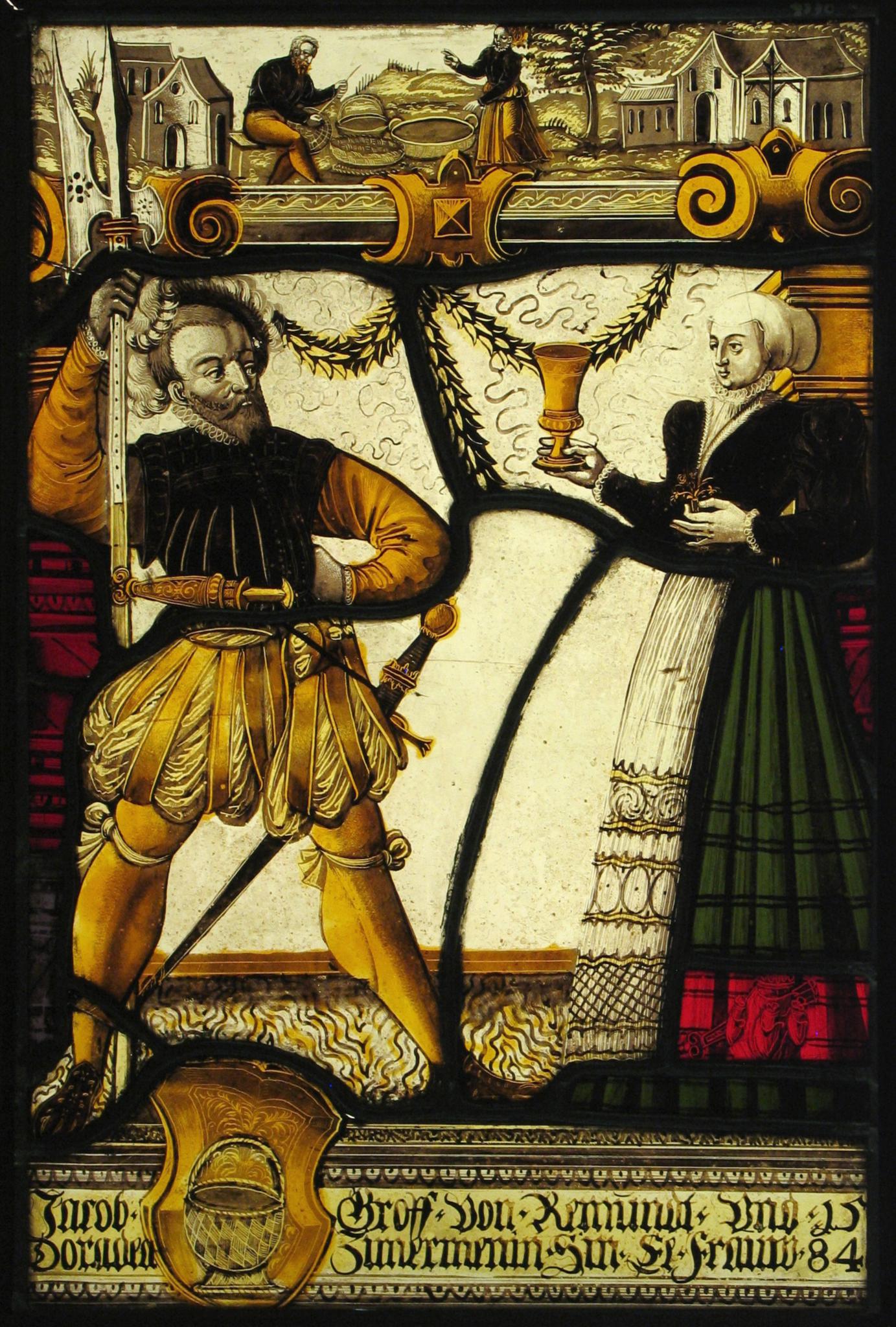 Die Scheibe zeigt das vor schnurverziertem, farblosem Grund auf marmoriertem Boden postierte Stifterpaar. Zur linken Seite steht breitbeinig der bärtige Mann in gelbem Hemd, schwarzem kurzärmeligem Wams, gelb geschlitzten weissen Pluderhosen, gelben Strümpfen und mit einem Federbarett auf dem Kopf. Schwert und Schweizerdolch an seinem Gürtel festgemacht, hält er in der Rechten die Halbarte. Seine Gemahlin ist in eine weisse Haube und Schürze sowie einen langen grünen Rock mit rotem Saum gekleidet. Während sie ihm in ihrer Rechten den Willkommtrunk in einem Pokal entgegenstreckt, hält sie in der Linken einen kleinen Strauss. Die Seitenrahmung bilden rote Säulen mit gelben Kapitellen, die ein Gebälk mit Rollwerkschmuck tragen. Im Oberbild ist das Stifterpaar in einer Landschaft zwischen Gebäuden festgehalten. Zwischen dem auf einer Bank sitzenden Mann und seiner Frau befinden sich am Boden geflochtene Körbe, auf welche diese weist. Der Stifter ist gerade dabei, einen solchen Korb herzustellen. Das Podium am Scheibenfuss ist mit der Stifterinschrift und dem Stifterwappen belegt.