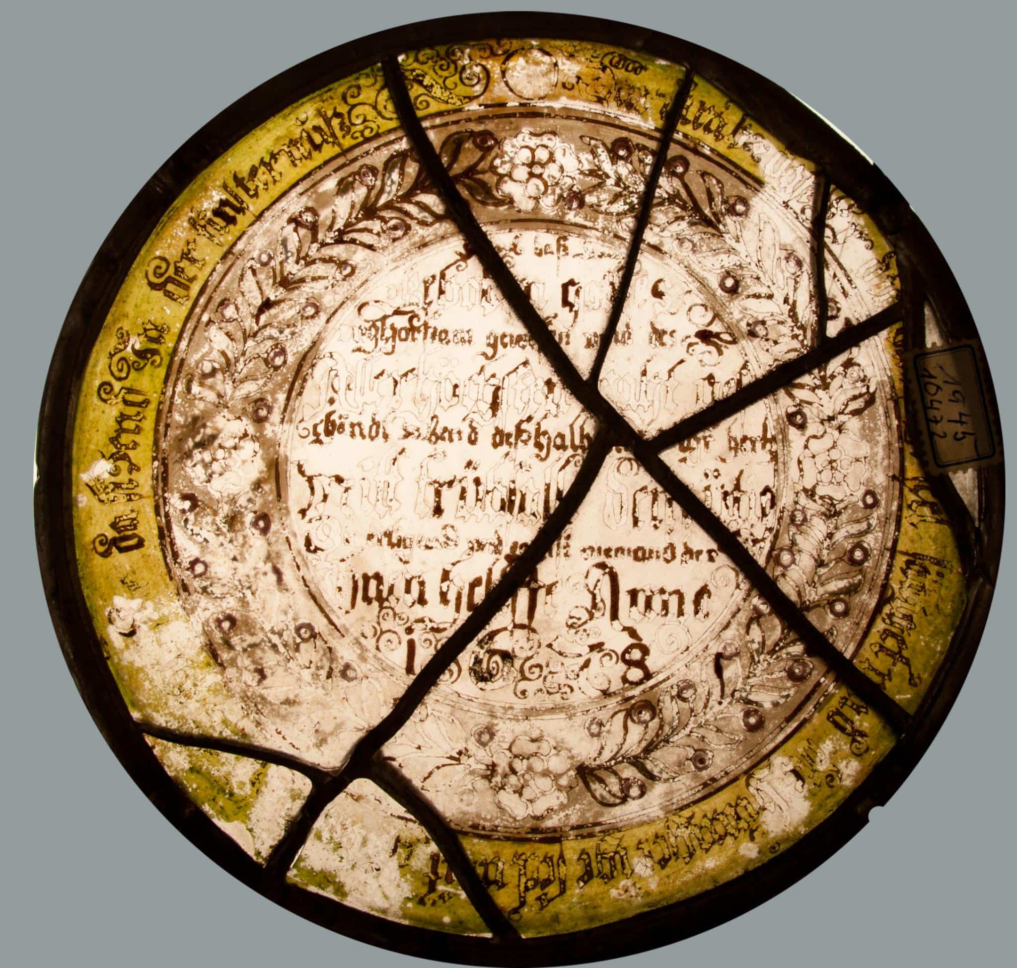 Auf der Scheibe festgehalten ist der folgende, nur noch teilweise lesbare Spruch aus dem Psalm 107, 9–12: "Dass er sättigt die durstige Seele / und die Hungrigen füllt mit Gutem / die da sitzen mussten in der Finsternis und Dunkel / gefangen in Zwang und Eisen / weil sie Gottes Geboten ungehorsam waren / und den Ratschluss des Höchsten verachtet hatten, / so dass er ihr Herz durch Unglück beugte."