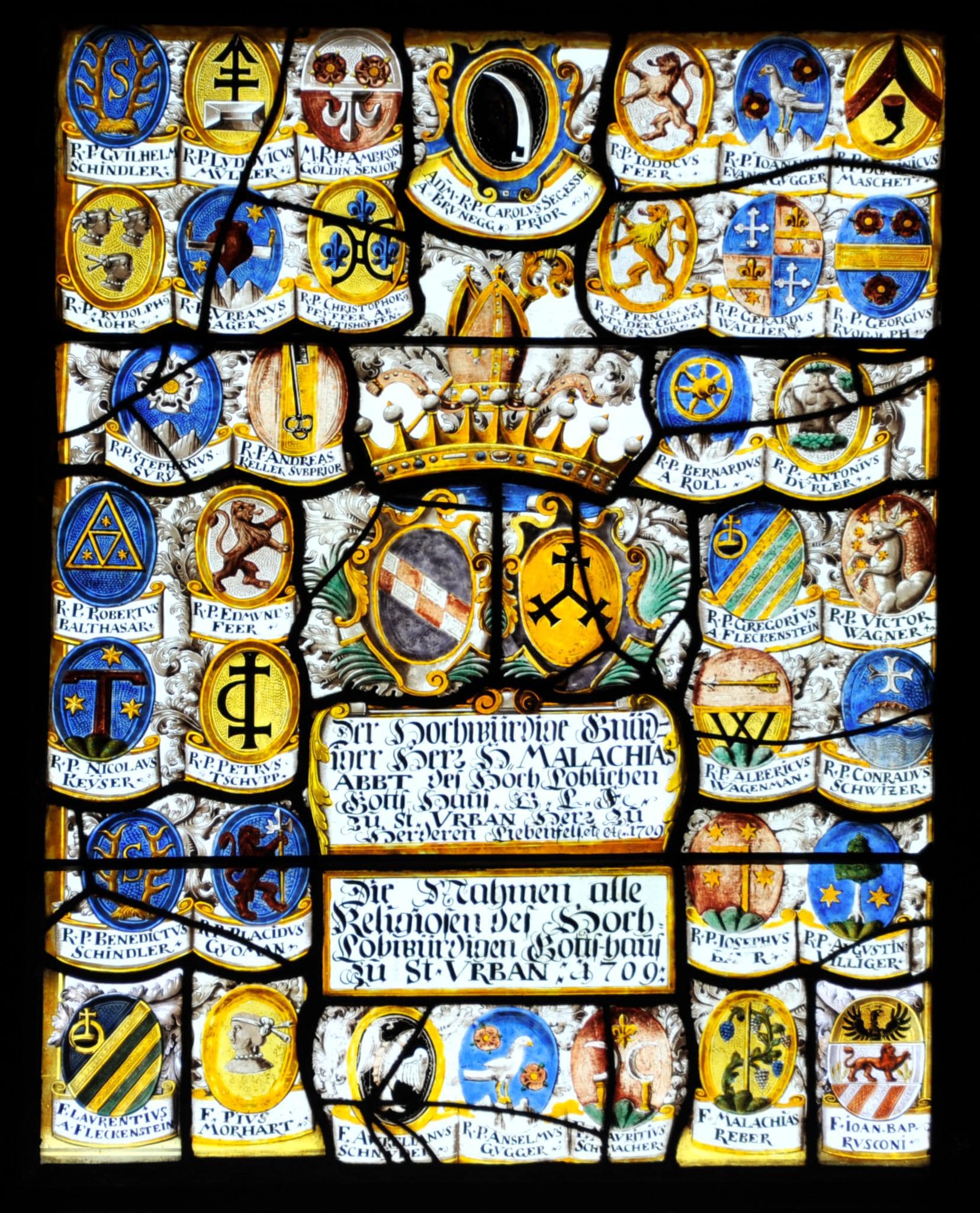 Wappen Abt Malachias Glutz St. Urban; Cîteaux; Konventsangehörige: Wilhelm Schindler, Ludwig Müller, Ambrosius Gödlin der Ältere, Karl Segesser von Brunegg, Jodokus Feer, Johannes Evan. Gugger, Dominikus Maschet, Rudolf Mohr, Urban Sager, Christoph Pfyffer von Altishofen, Franziskus Studer, Gerhard Vallier (Wallier), Georg Rudolph (Rudolf), Stefan Suri, Andreas Keller, Bernhard von Roll, Antonius Dürler, Robert Balthasar (Baltasar), Edmund Feer, Gregor von Fleckenstein, Viktor Wagner, Niklaus Keyser (Kaiser), Peter Tschupp, Albericus Wagenmann (Wägmann), Konrad Schwizer (Schweizer, Schwyzer), Benedikt Schindler, Placidus Guomann, Joseph Baur (Bauer), Augustin Villiger, Laurentius von Fleckenstein, Pius Morhart, Aurelianus Schnyder (Schnider, Schneider), Anselmus Gugger, Mauritius (Moritz) Schumacher (Schuhmacher, Malachias Reber, Johannes Baptist Rusconi