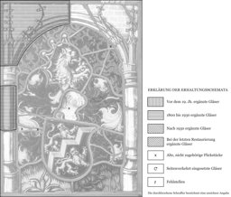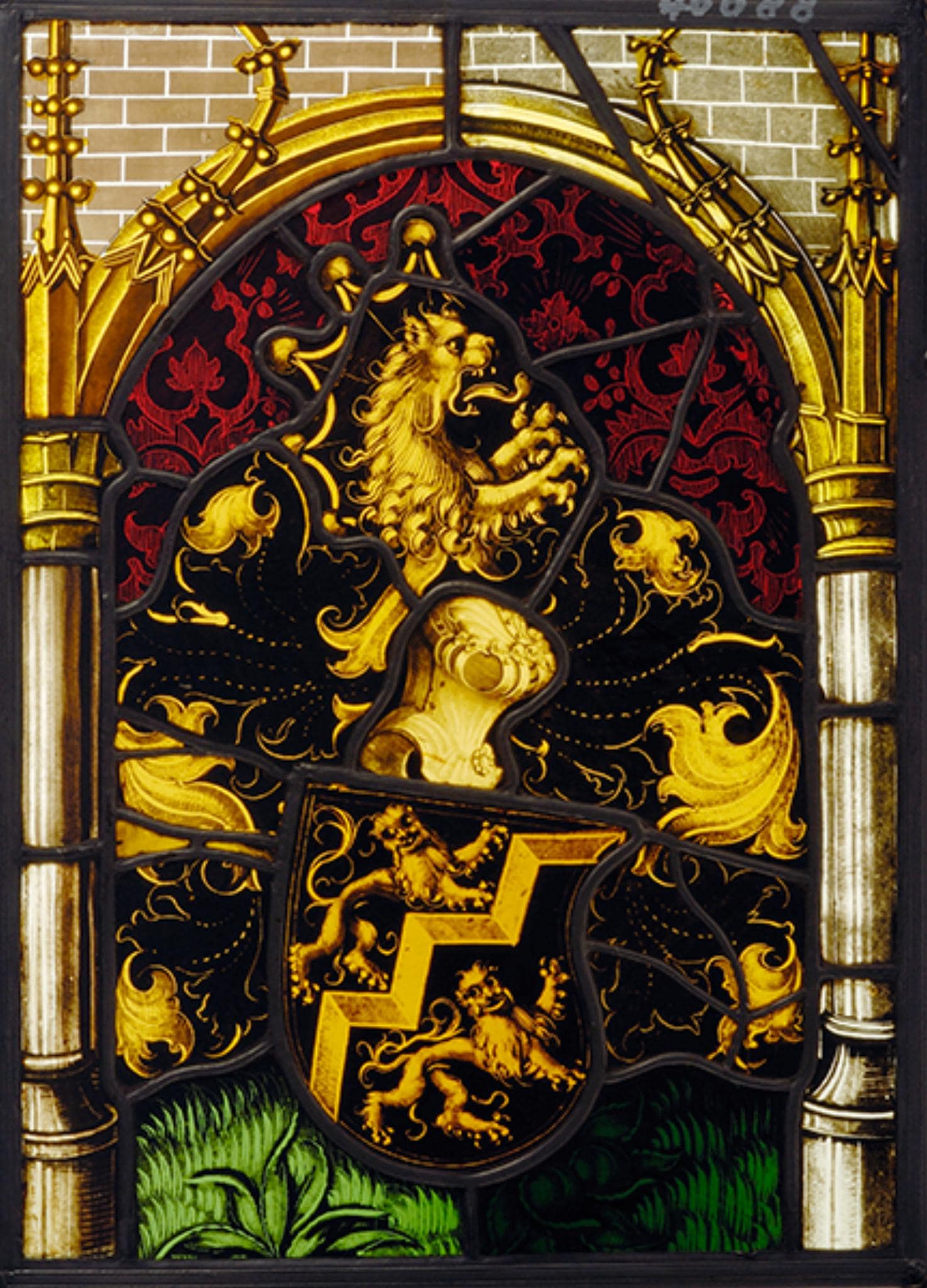 Das heraldisch nach links gewendete Von-Diesbach-Vollwappen steht vor rotem, grossflächigem Damastgrund auf grünem Rasenboden. Es wird von einem Rundbogen gerahmt, dessen seitlichen Stützen von Fialen überhöht sind. Die Zwickelfelder über dem Bogen füllt Mauerwerk.