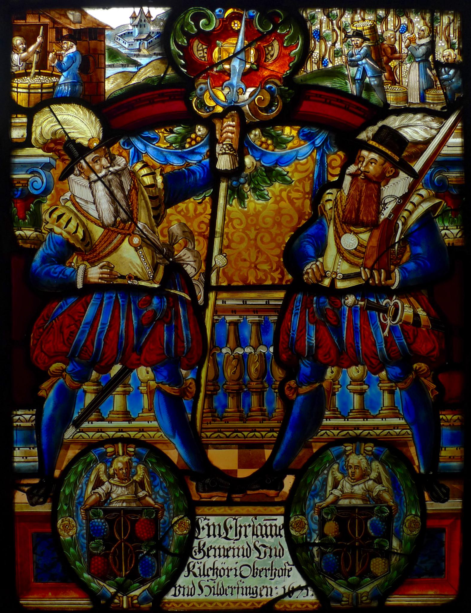 Die Wappenschilde der Gemeinden Oberhofen und Hilterfingen befinden sich zu Seiten der Stifterinschrift vor dem Podium am Scheibenfuss. Von ovalen Lorbeerkränzen umfasst, werden sie von je einem Engel gehalten. Auf dem braun und gelb gefliesten Podium sind als Schildwächter ein Halbartier und Büchsenschütze postiert. Mit Schwert und Ehrenketten ausgerüstet, tragen beide ein langärmeliges blaues Hemd, ein Lederwams, blau gestreifte rote Pluderhosen, blaue Strümpfe und einen schwarzen Federhut. Hinter ihnen zieht sich vor gelbem Damastgrund eine zwischen die dunkelroten Rahmenstützen gesetzte Balustrade hin. Die Rahmung krönt ein dunkelroter Flachbogen mit mehrfarbiger Scheitelkartusche. Die beiden Figurenbilder seitlich davon schildern, wie die Einwohner Oberhofens und Hilterfingens im Rebberg die Trauben einbringen (rechts) und wie sie diese keltern (links). Die Kelterung spielt sich vor einer Holzhütte ab, in deren Hintergrund die Thunerseelandschaft mit Schloss Oberhofen fantasievoll wiedergegeben ist.