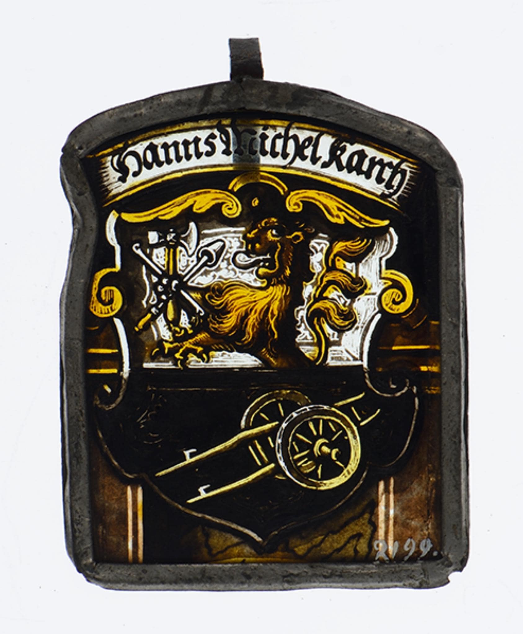 Das kleine Wappenscheibchen stellt nur das Fragment einer grösseren Scheibe dar. Während der untere Teil des Wappens lautmalerisch auf den Namen anspielt (Karren, Charre), hält der Löwe in der oberen Teilung in seiner Tatze die drei Glaserwerkzeuge Kröseleisen, Glaserhammer und Lötkolben. Ein Glaser Hans Michel Karch ist bislang nicht bekannt. Die gleichnamige Familie ist im 17. Jahrhundert vorwiegend in Süddeutschland nachweisbar.