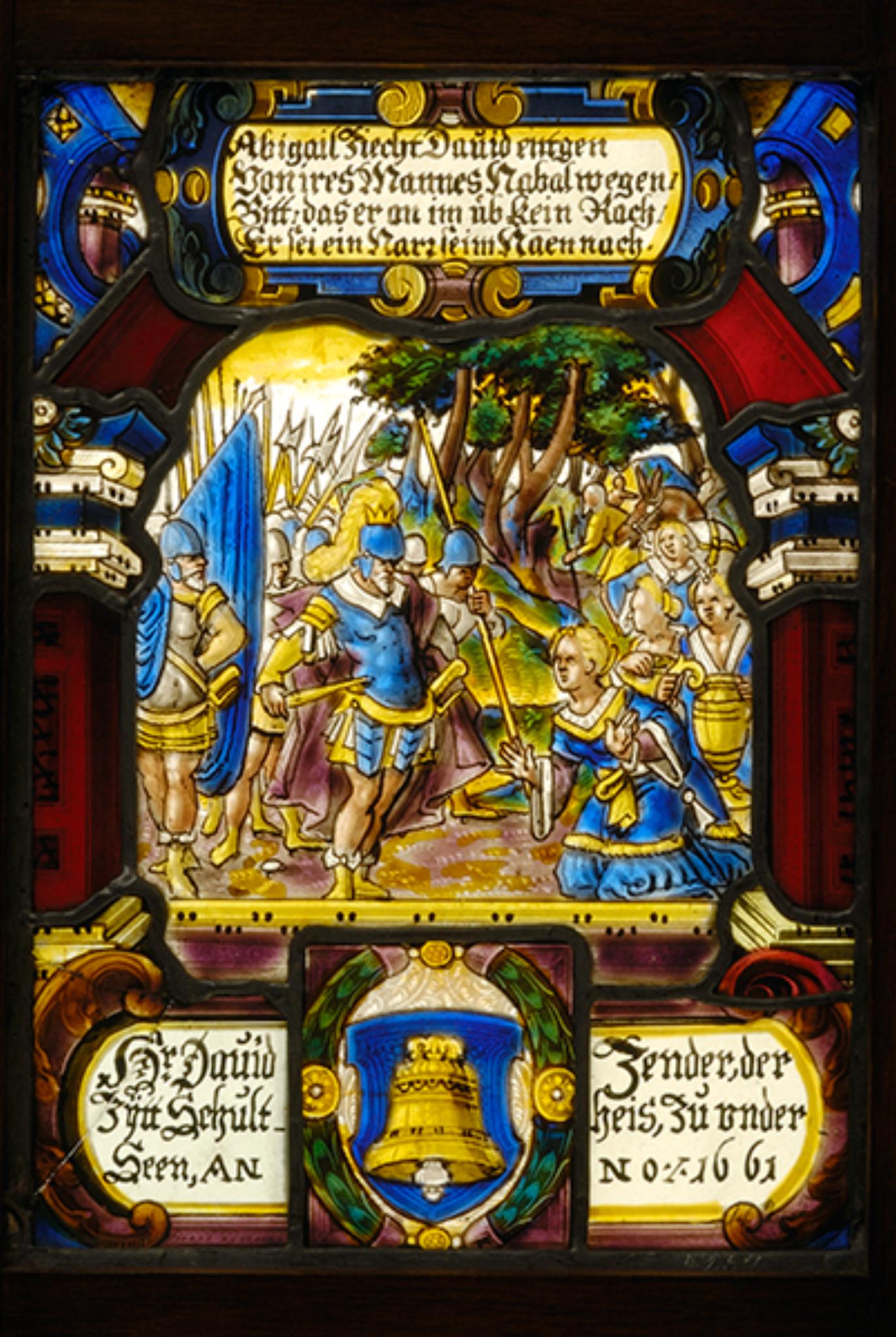 Das Hauptbild zeigt David als Feldherrn mit seinen Kriegern und vor ihm kniend Abigail, die diesen um Gnade für ihren Mann Nabal bittet (1 Sam 25, 25). Die Szene umrahmt ein mächtiger roter Bogen, an dessen Scheitel die erneuerte Bildlegende in einer blau-gelben Rollwerkkartusche angebracht ist. Eine weitere, violette Rollwerkkartusche füllt den Scheibenfuss. Die Stifterinschrift enthaltend, wird sie in der Mitte durch den oval umkränzten Schild mit dem Wappen David Zeenders unterbrochen.