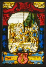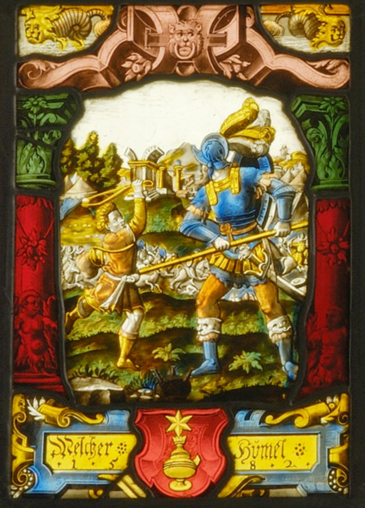 Im Vordergrund sind Davids Kampf gegen Goliath (1 Sam 17, 49f.) und dahinter in einer Wiesenlandschaft das Gefecht der Israeliten gegen die Philister festgehalten. Die Szene rahmt eine Arkade aus hermengeschmückten roten Säulen mit grünen Kapitellen und einem rosa Volutenbogen mit einer Löwenmaske im Scheitel. Den Scheibenfuss füllt die blau-gelbe Inschriftenkartusche, der das Wappen Melchior Hummels zentral aufgesetzt ist..