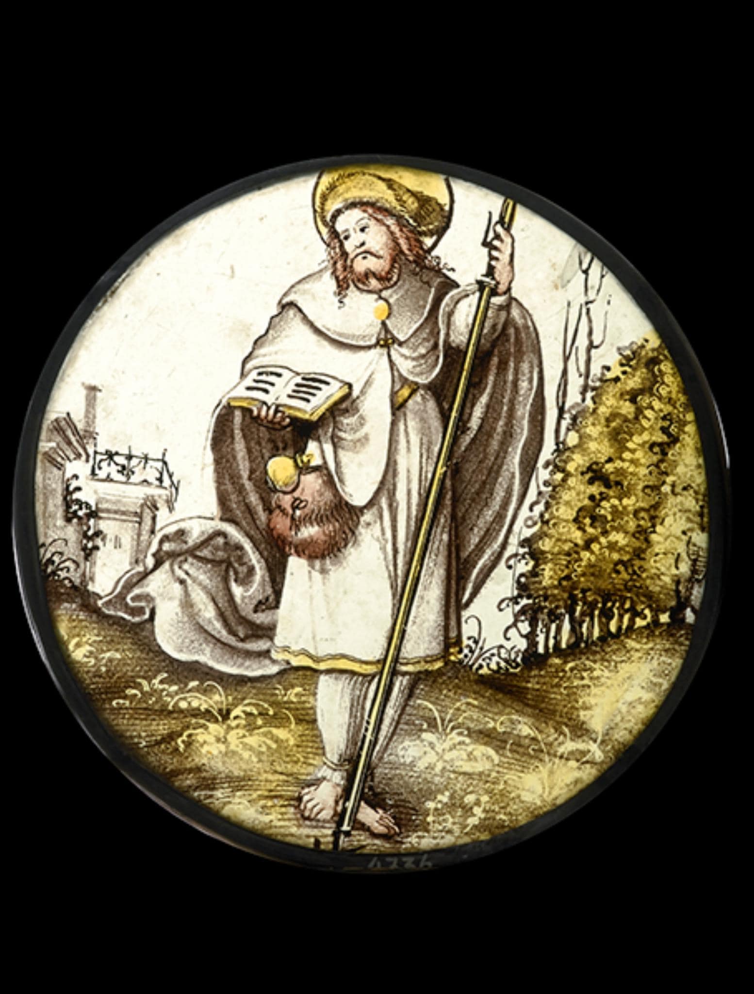 Die runde Grisaillescheibe zeigt einen nicht sicher identifizierbaren Pilgerheiligen (s. u.) mit Stab, Buch und Felltasche in einer Landschaft.