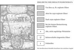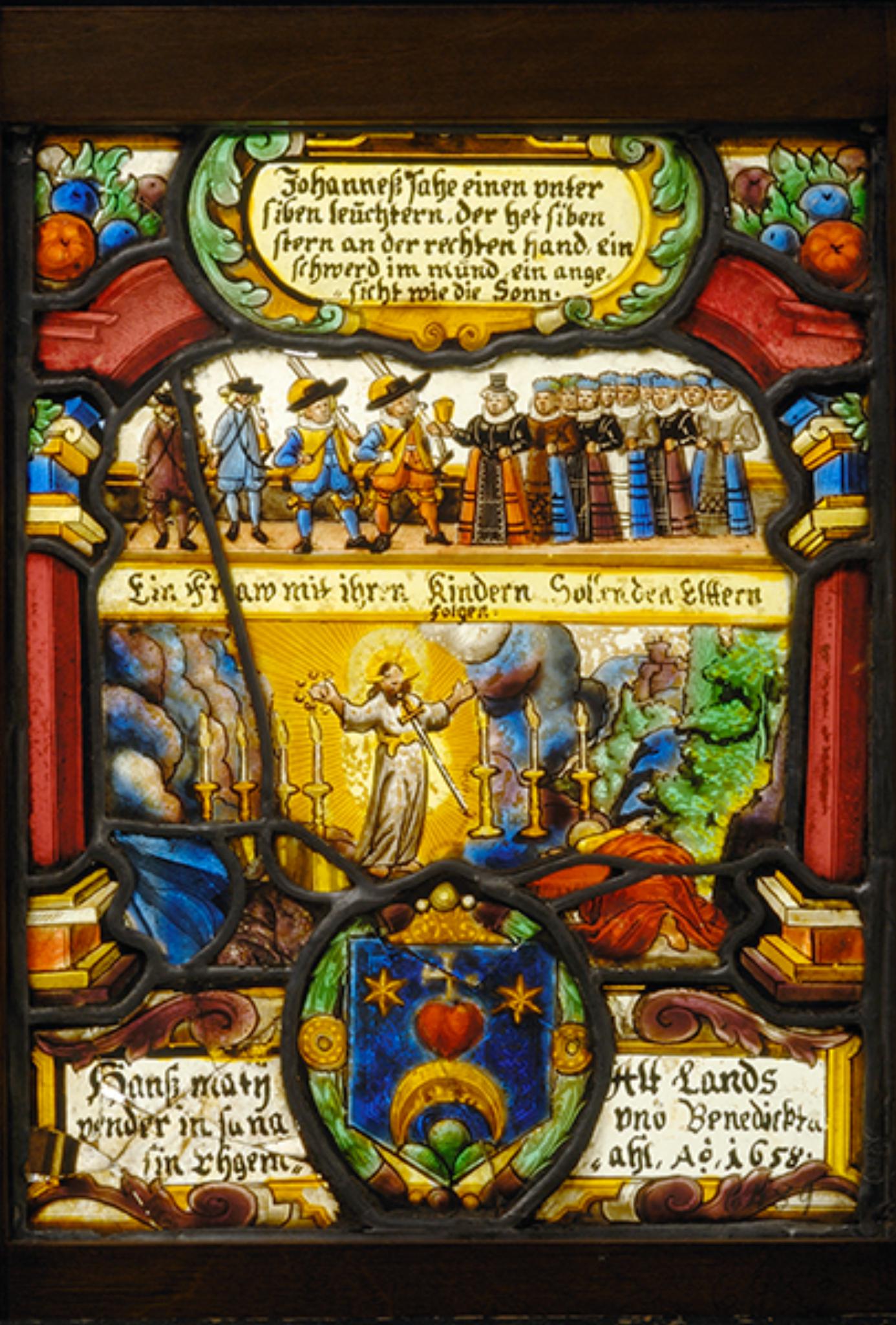Das Scheibenhauptfeld enthält zwei Figurenbilder. Davon zeigt das Obere einen älteren und drei jüngere Büchsenschützen in Reih und Glied. Ihnen steht eine Frauengruppe gegenüber, bei der es sich offenbar um die den Männern den Willkommtrunk anbietende Gattin des Stifters und ihre zahlreichen Töchter handelt. Erklärt wird die Szene durch die in der Leiste darunter angebrachte Inschrift. Im unteren Bildteil ist die in der Apokalypse geschilderte Leuchtervision des Johannes dargestellt. Erläutert wird die Szene (Apk 1, 9–20) durch die Bildlegende in der grün-gelben Rollwerkkartusche, die sich am Scheitel der roten Rahmenarkade befindet. Den Scheibenfuss füllt die Rollwerkkartusche mit den Stifternamen und dem oval umkränzten Wappen von Hans Matti im Zentrum.