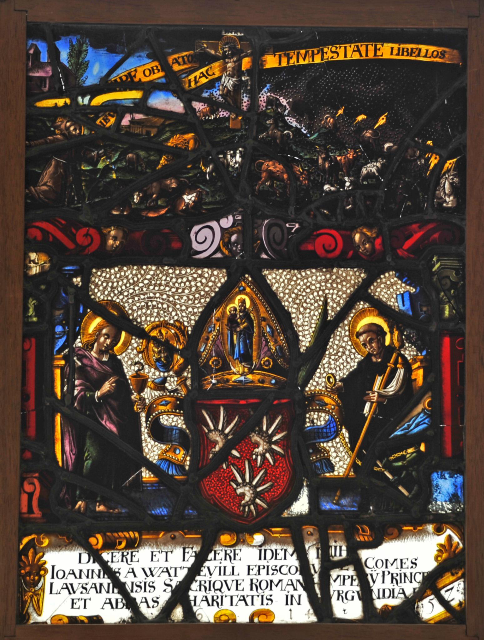 Im Zentrum erscheint vor weiss gefiedertem braunem Grund das von der Mitra mit dem Muttergottesbild überhöhte Wappen des Lausanner Bischofs Johann II. von Wattenwyl (Jean de Watteville). Den Wappenschild umfangen die Infuln der Mitra, ein Palmzweig und das Pedum, dessen Krümme erneut ein Marienbild ziert (die Kathedrale Lausanne war der Gottesmutter geweiht und barg ein berühmtes Mariengnadenbild). Zur linken Seite des Schilds ist der Namenspatron des Stifters, Johannes der Täufer, dargestellt. In einen violetten Umhang gehüllt, segnet er mit seiner Rechten den Becher mit der Schlange. Ihm gegenüber steht der in ein schwarzes Mönchsgewand gekleidete hl. Bernhard von Clairvaux. In seiner Linken Buch und Abtstab haltend, führt der Ordensgründer der Zisterzienser in der Rechten einen Hund an der Kette. Dieser erschien Bernhards Mutter im Traum als Sinnbild dafür, das ihr Sohn als grosser Prediger das Haus Gottes bewachen werde. Unter Figuren und Wappen befindet sich die Stifterinschrift in einer gelben Rollwerkkartusche. Das durch die vielen Sprungbleie in seiner Lesbarkeit beeinträchtigte Oberbild zeigt links die Stigmatisation des hl. Franziskus sowie rechts in paradiesischer Landschaft weidende Tiere (Schafe, Ziegen, Kühe, Pferde etc.), über die sich aus Gewitterwolken ein Hagelschauer ergiesst. Diese ungewöhnliche Darstellung thematisiert ein vom hl. Bonaventura beschriebenes Ereignis aus dem Leben des hl. Franziskus (s. Bergmann). Nach Bonaventuras Legendenbericht soll derselbe bei seinem Aufenthalt in der Einsiedelei von Greccio von den dortigen Einwohnern erfahren haben, dass Hagelstürme ihre Felder verwüsteten und reissende Wölfe ihr Vieh vernichteten. Um diesem Unheil ein Ende zu setzen, riet er ihnen, Busse zu tun. Als die Einwohner seinem Rat folgten, wichen die Plagen. Johann II. von Wattenwyl verlieh in seiner Scheibenstiftung dem auf Bonaventuras Schilderung beruhenden Bild jedoch einen ganz neuen Sinn. Zum Verständnis dafür dient die sich über das Oberbild hinziehende lateinische Inschrift. Sie spielt auf die Büchlein oder Schriften der katholischen Lehre an, die dem Unwetter, das heisst den Gefahren der Reformation ausgesetzt sind. Nach Uta Bergmanns überzeugender Interpretation wird der durch die Reformation bedrohte alte Glaube hier durch die vom Bären, dem Wahrzeichen des protestantischen Stadtstaates Bern, angegriffene Herde symbolisiert (die durch Sprungbleie teilweise verdeckte Bärenfigur ist über dem Engelskopf im rechten roten Gebälk festgehalten). Den Gegenpol dazu bildet der Löwe, der sich auf der Seite der erschütterten Christen dem wahren Glauben zuwendet. Vor dem Gekreuzigten am Boden kauernd, richtet er hier seinen Blick auf den vor ihm knienden hl. Franziskus.