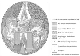 Zahlreiche neue Ergänzungen (der Damastgrund ist vollständig neu) und vier alte Flickstücke; zahlreiche Sprungbleie; die Verbleiung erneuert.
